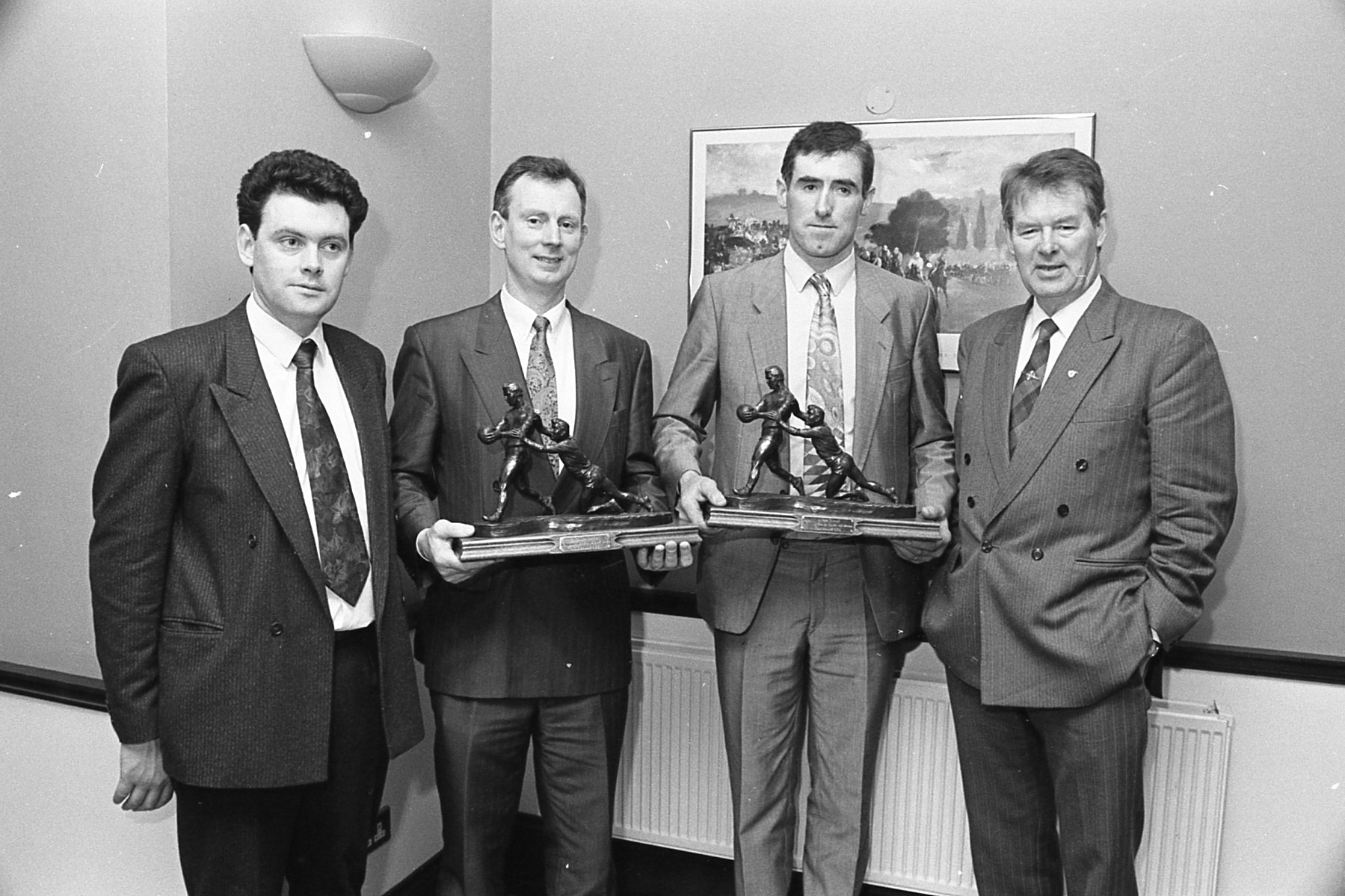 Caption: RTÉ GAA commentator and broadcaster Micheál Ó Muircheartaigh was the special guest at the Dromard GFC dinner dance in February 1993 and pictured are Joe Murphy (Club Chairman), special award winners Dessie Sheridan and Peter Mimnagh with Mr Ó Muircheartaigh. Photo by Joe McDonagh