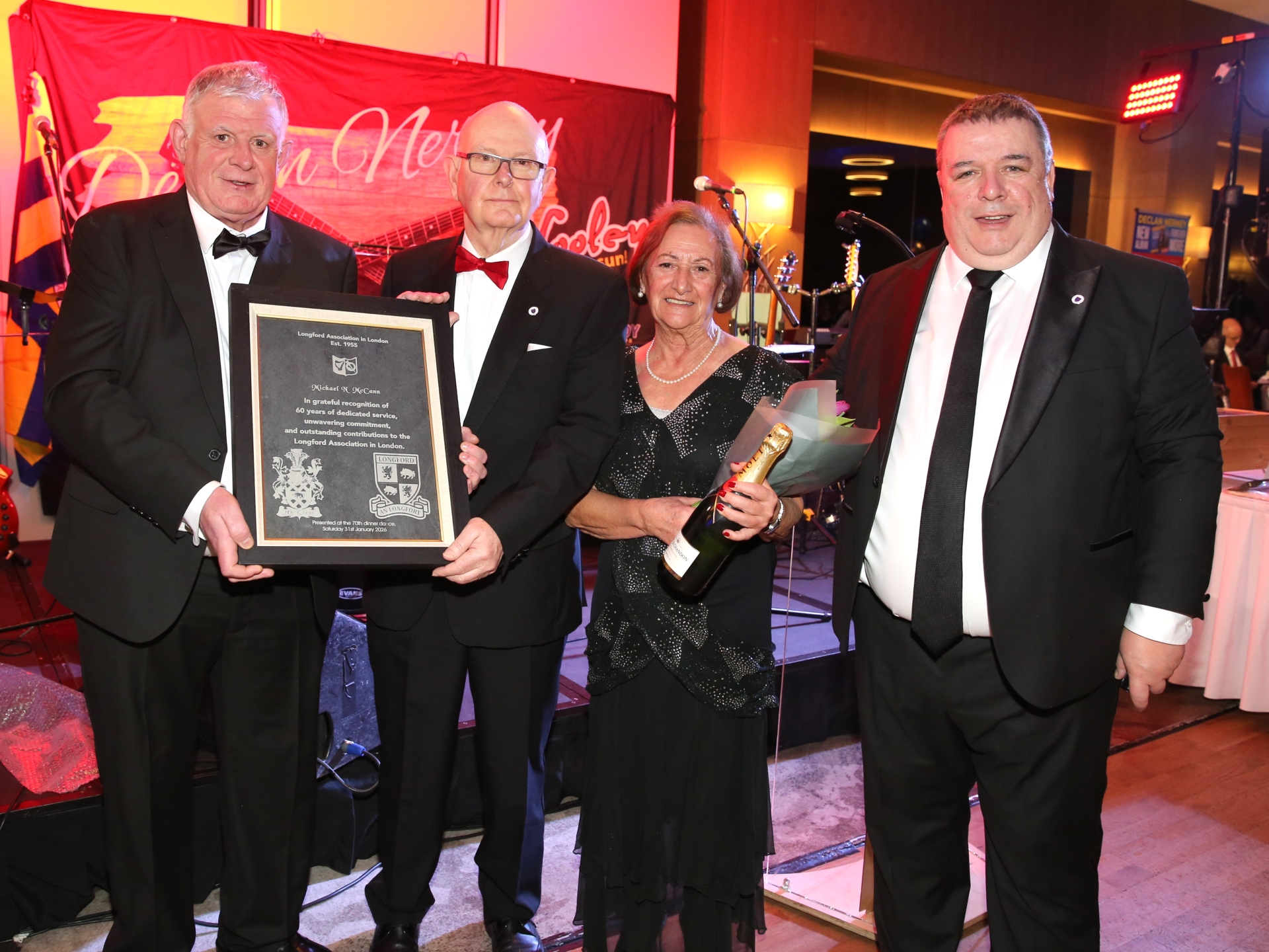 Caption: Longford Association in London Chairperson Dan Keogh and President Aiden Ganley made a presentation to Michael McCann who was recognised for 60 years of dedication and unwavering commitment and outstanding contribution to the Longford Association in London Picture: Lucia Butler