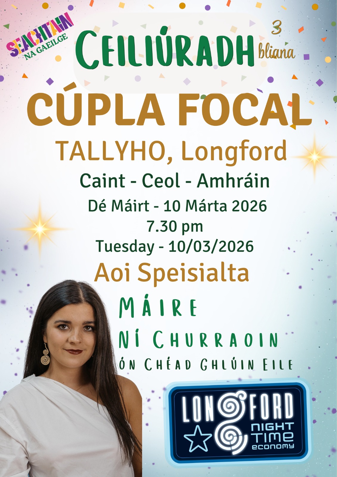 Proudly supported by the Longford Night Time Economy, Cúpla Focal with Máire Ní Churraoin gets underway at the Tally-ho from 7.30pm on Tuesday, March 10 and all are welcome.