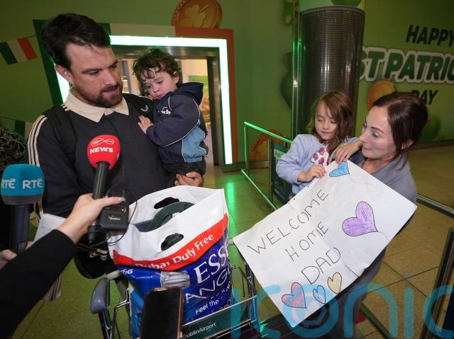 Caption: Jimmy O’Connor, from Longford, is welcomed home as he arrives at Dublin Airport (Niall Carson/PA)