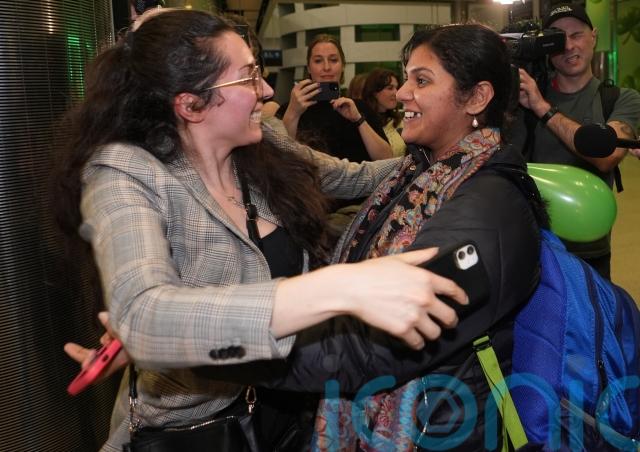 Caption: Upama Ghosh (right) from India is met by her friends as she arrives at Dublin Airport on a flight from Dubai in the United Arab Emirates (Niall Carson/PA)