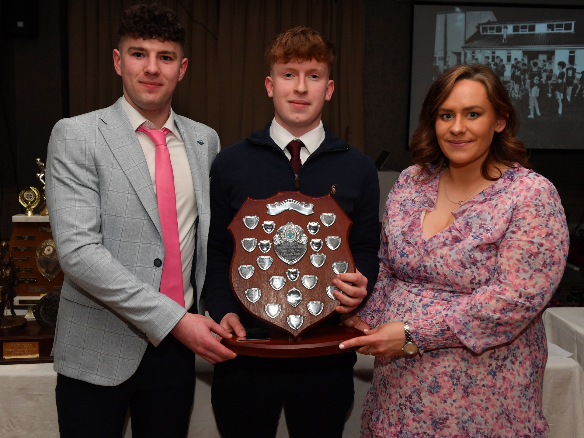 Caption: Oisin Kane and Sean Gibbons being presented with the St Vincent's joint U18 Players of the Year by Bronagh Brady