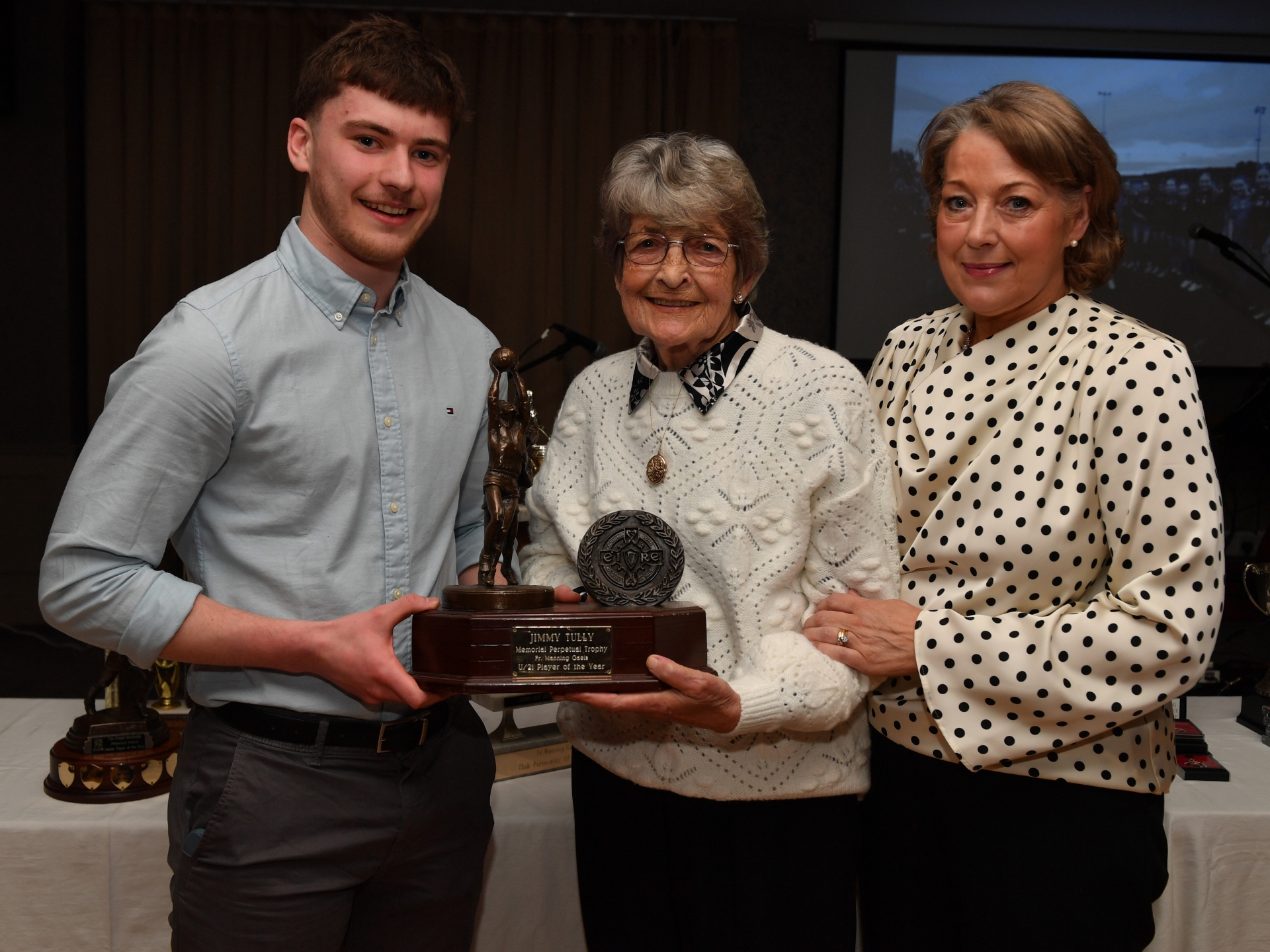 Caption: Jamie Nertney being presented with the Fr Manning Gaels Young Player of the Year award by Mary and Kathleen Tully