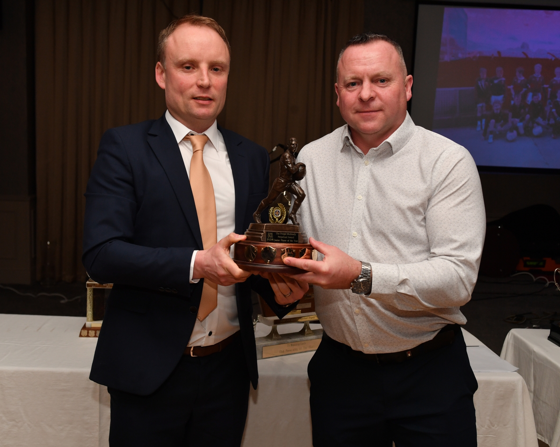 Caption: Martin Mulleady presenting the Fr Manning Gaels Junior Player of the Year to Ciaran Cooney