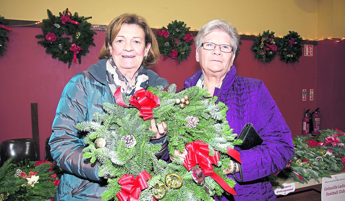 Rosaleen Briody and Ethel Ellis hold up a beautifully-crafted Christmas wreath at the Colmcille Christmas market, which took place recently. Photo: Michelle Ghee