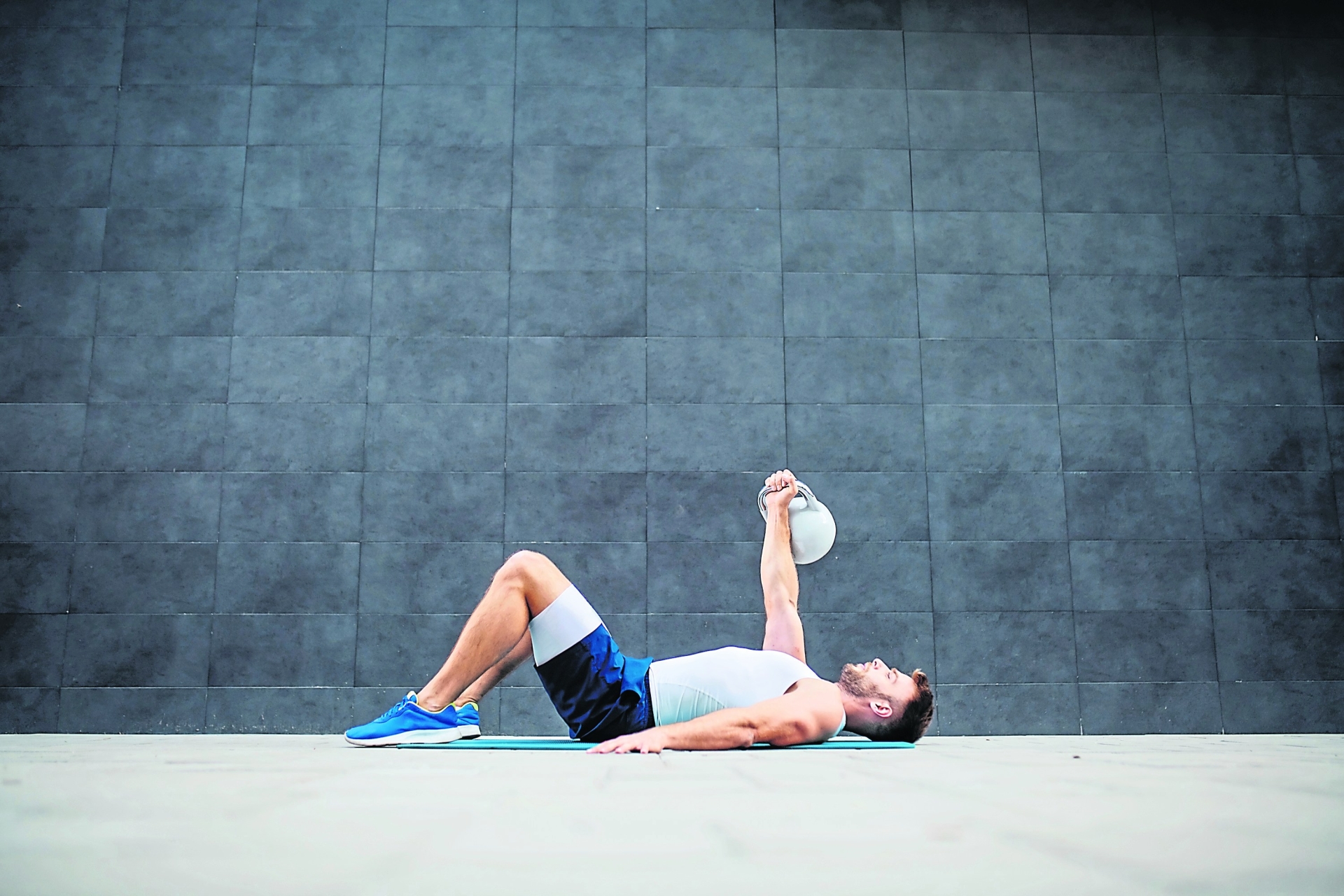 “Lie back onto the floor and straighten out your legs, arching your lower back slightly. Slowly lower the kettlebell, keeping your elbows to the side and lower until your upper arm touches the floor.