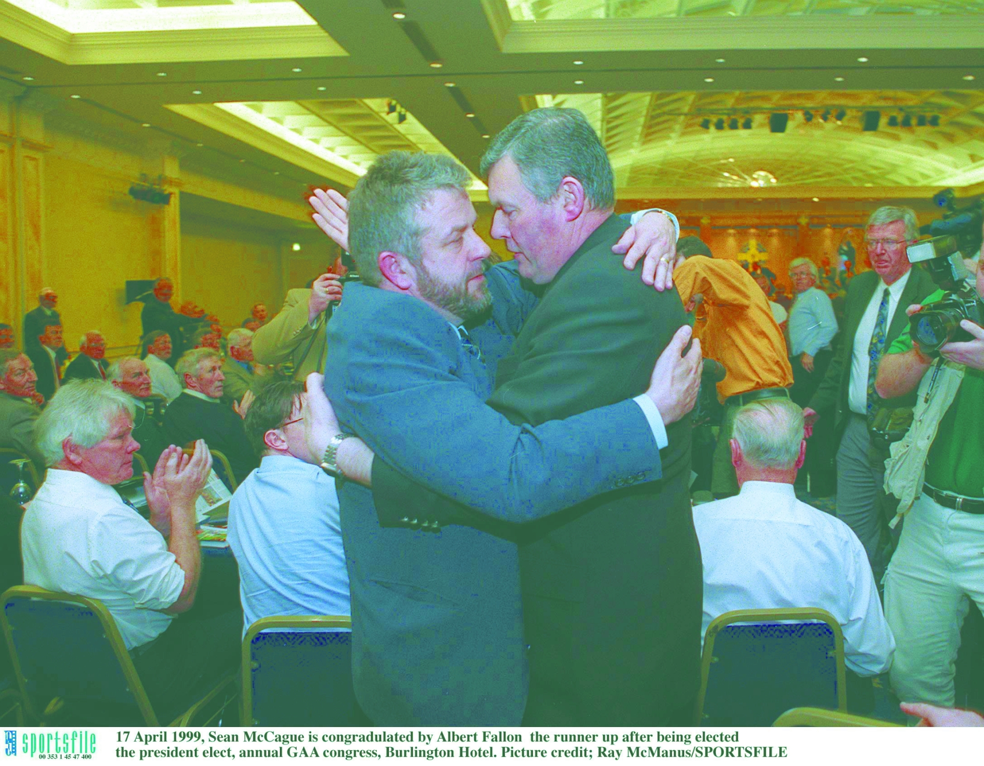 Caption: 1999: Albert Fallon's Presidency hopes flounder in the Burlington Hotel – A victorious Sean McCague and Albert Fallon embrace one another after the result of the GAA Presidency election