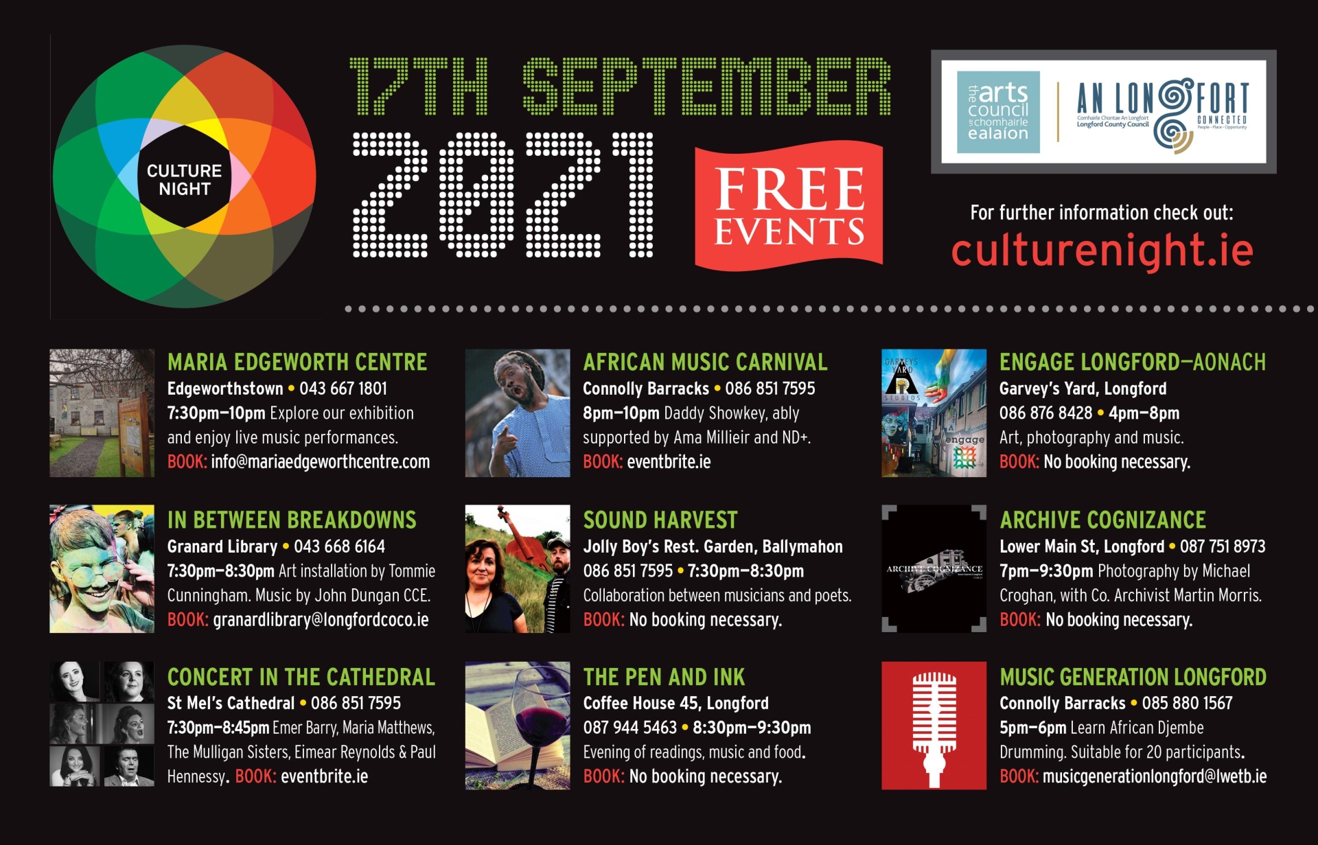 Culture Night in Longford is funded by the Arts Council in partnership with Longford County Council Arts Office and coordinated by Republic of Culture Ltd.