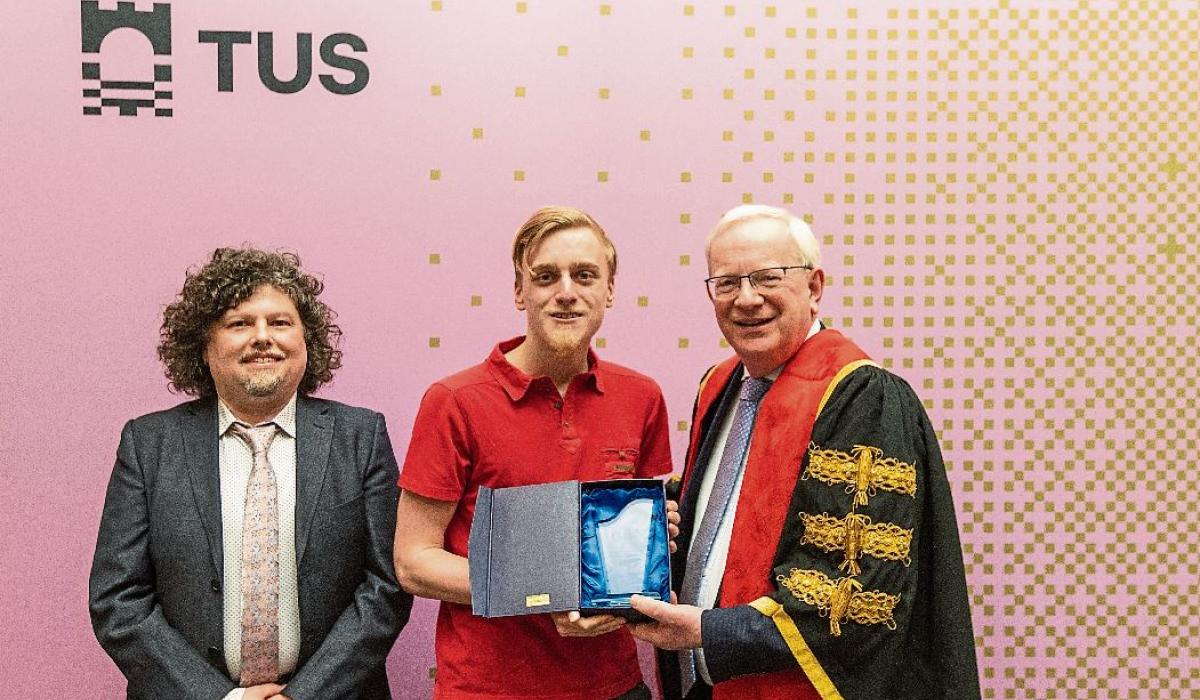 TUS Scholarship of Excellence award recipient Douglas Felce pictured with TUS engineering lecturer Keith Vaugh and TUS President Professor Vincent Cunnane Picture: Nathan Cafolla