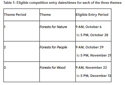 The final theme, 'Forests for Wood' will continue between 22 November and December 13. Please note that only photos received within these dates and time periods for each theme can be considered eligible.