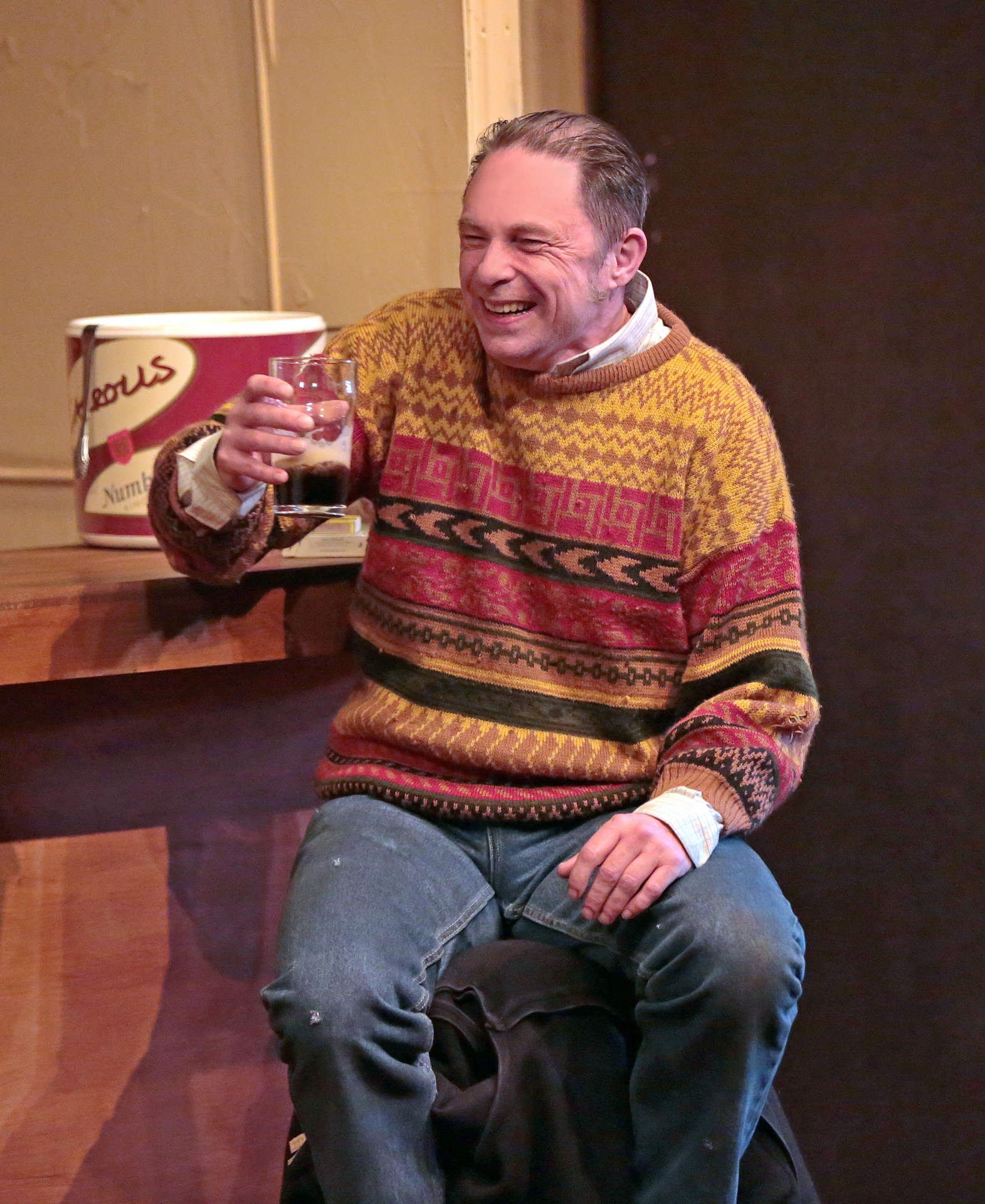 Caption: Tom Lyons as 'Junior' seeing the funny side of things as he enjoys his pint during the Backstage Theatre Group production of ‘Conversations on a Homecoming’ Picture: Shelley Corcoran