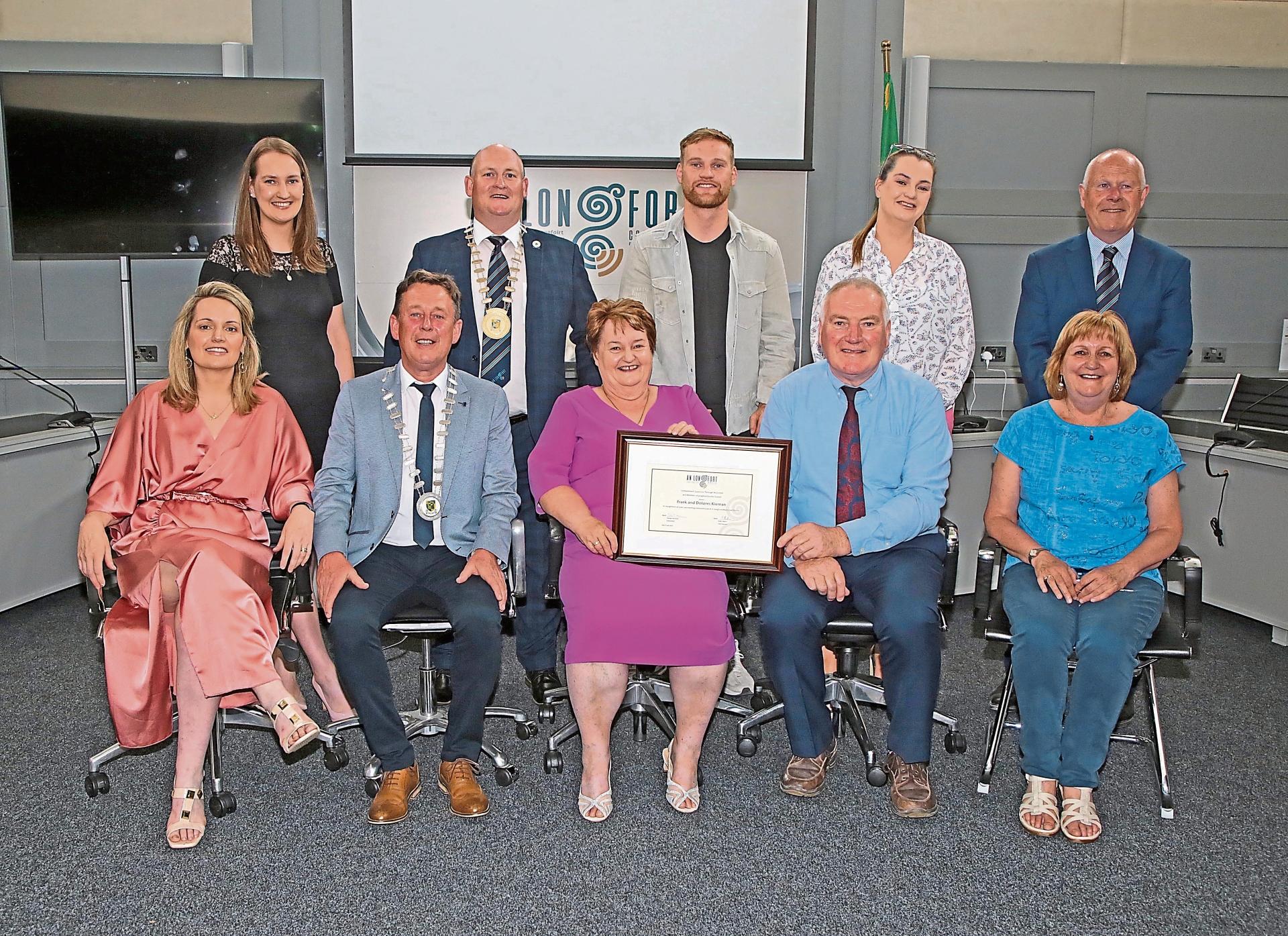 Frank and Dolores Kiernan pictured with their family, Longford County Council Cathaoirleach Cllr Turlough McGovern; Longford County Council Chief Executive Paddy Mahon and Cathaoirleach of Longford Municipal District Cllr Gerard Hagan; after receiving a Cathaoirleach Award for 2023 Picture: Shelley Corcoran