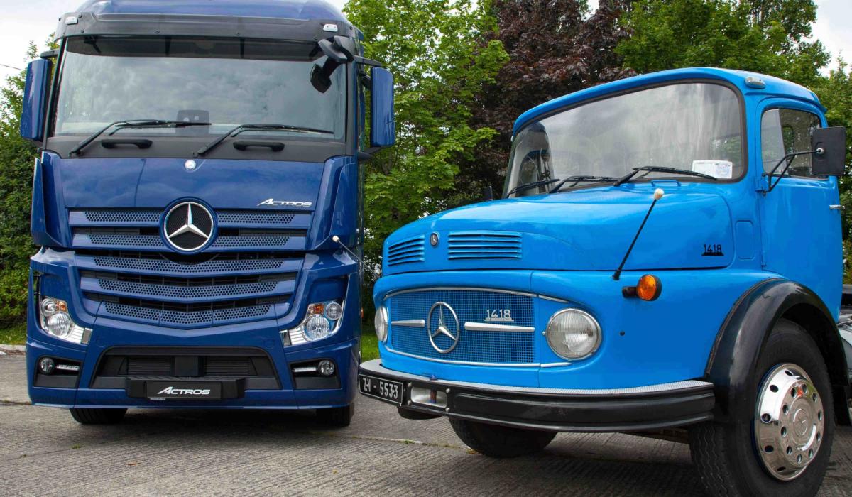A fully restored Mercedes-Benz model 1418 ‘bull nose’ – the first to be imported into Ireland in 1967 – pictured alongside a current model of the heavy-duty Actros.