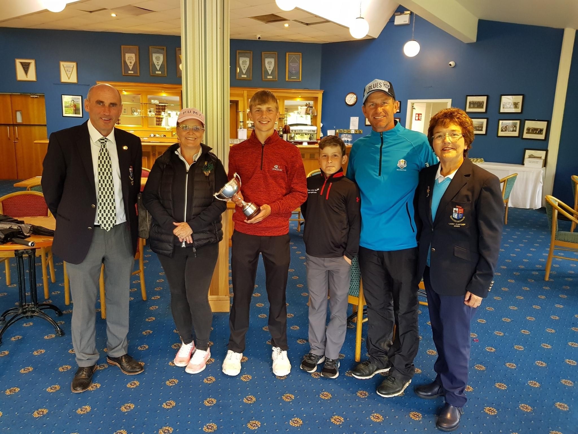 Caption: Winner of the Irish U14 Boys Amateur Open at County Longford Golf Club, Enniscorthy's Sean Cooper pictured with his with his parents and younger brother Ruairí. Also in the photograph are Colm Hughes County Longford Golf Club Captain and Annette Kane County Longford Golf Lady Captain.