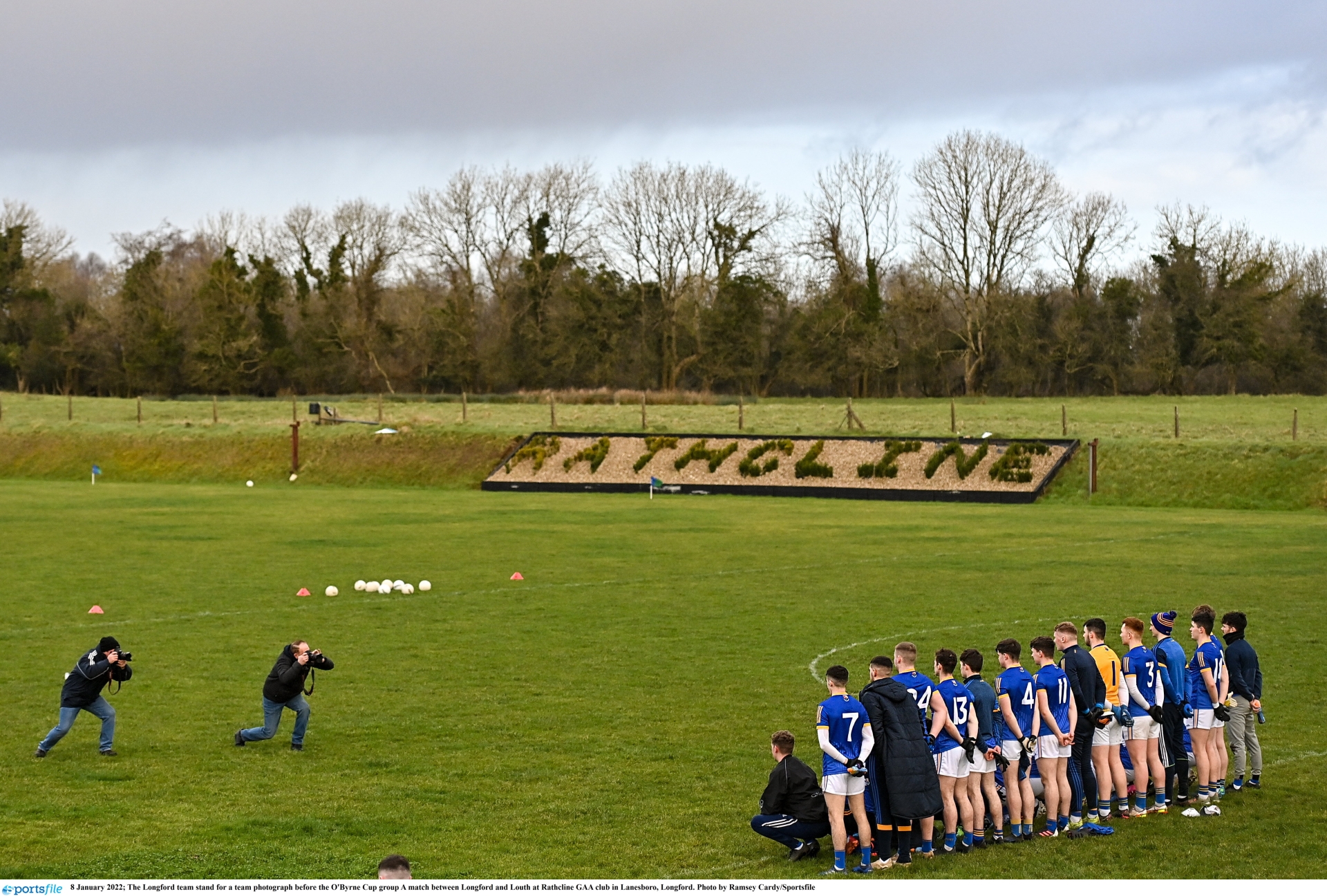 The Longford team stand for a photograph taken by Syl Healy for the Longford Leader and freelance photographer Gerry Rowley before the O'Byrne Cup group A match between Longford and Louth at Rathcline GAA club in Lanesboro, Longford Photo by Ramsey Cardy/Sportsfile