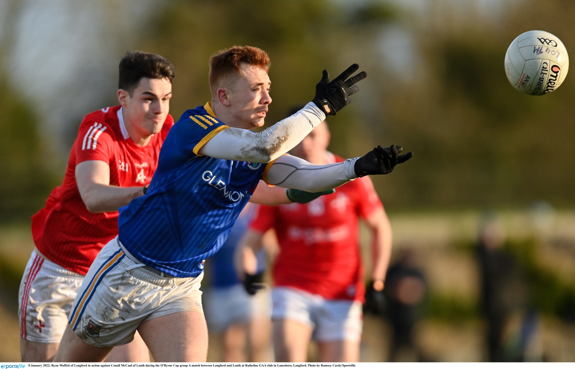 Ryan Moffett of Longford in action against Conall McCaul of Louth during the O'Byrne Cup group A match between Longford and Louth at Rathcline GAA club in Lanesboro, Longford. Photo by Ramsey Cardy/Sportsfile