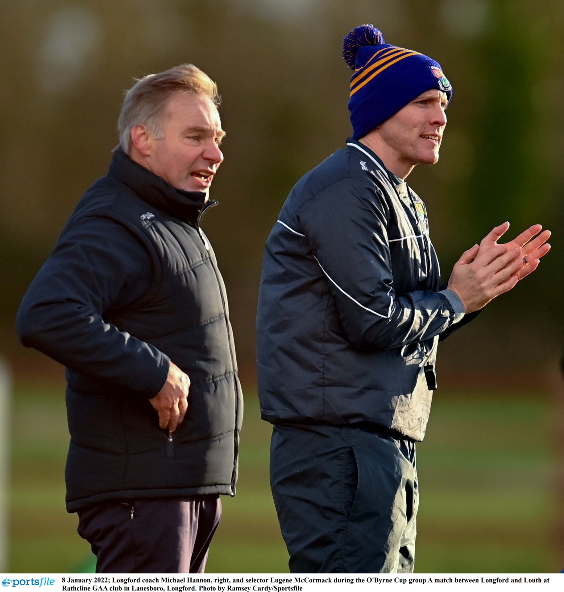 Longford coach Michael Hannon, right, and selector Eugene McCormack during the O'Byrne Cup group A match between Longford and Louth at Rathcline GAA club in Lanesboro, Longford. Photo by Ramsey Cardy/Sportsfile