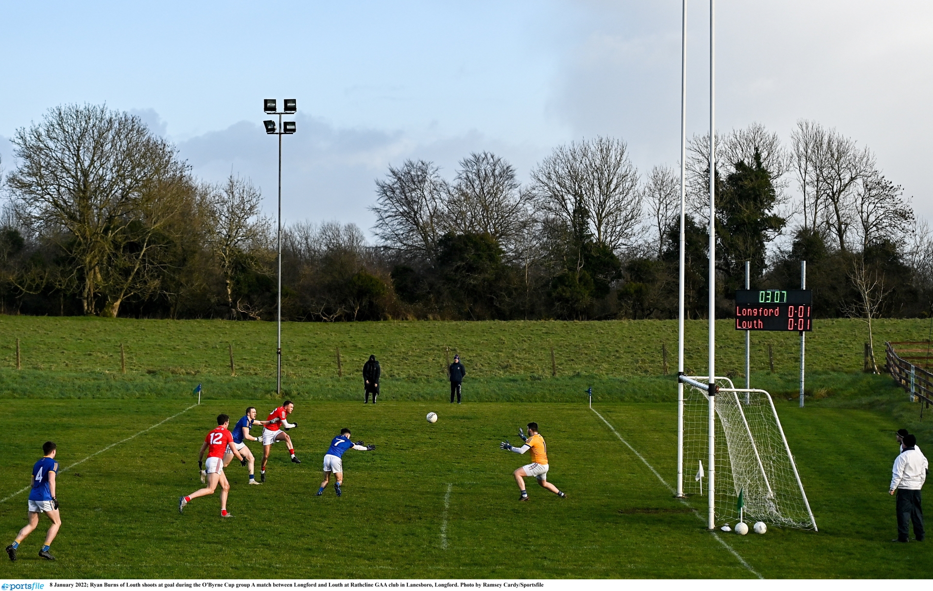 Ryan Burns of Louth shoots at goal during the O'Byrne Cup group A match between Longford and Louth at Rathcline GAA club in Lanesboro, Longford. Photo by Ramsey Cardy/Sportsfile