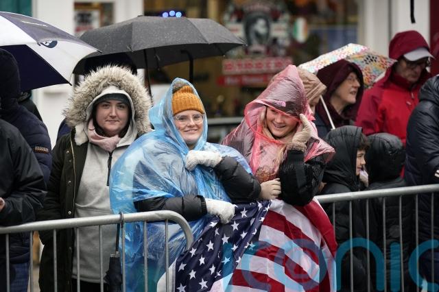 As the rain tailed off, Mr Biden spent around 10 minutes speaking to poncho-clad onlookers who stood behind barricades, having waited patiently in miserable conditions waving small US flags.