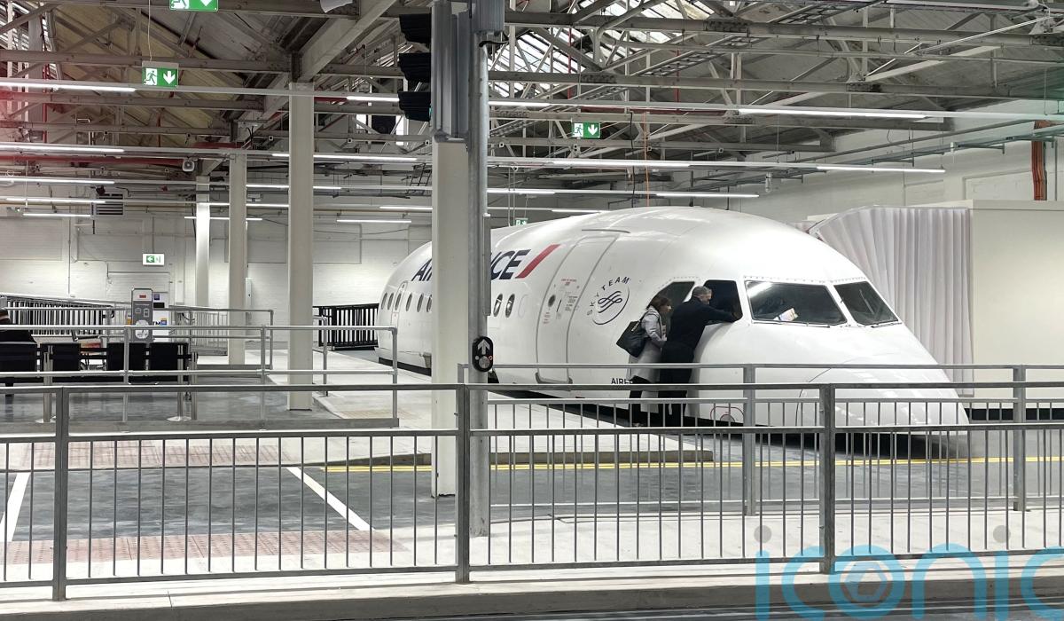 It includes half an Airbus A319 plane, part of a Luas tram, part of a DART carriage, pathways, cycle lanes, traffic lights, buses and an example of an airport security scanner.