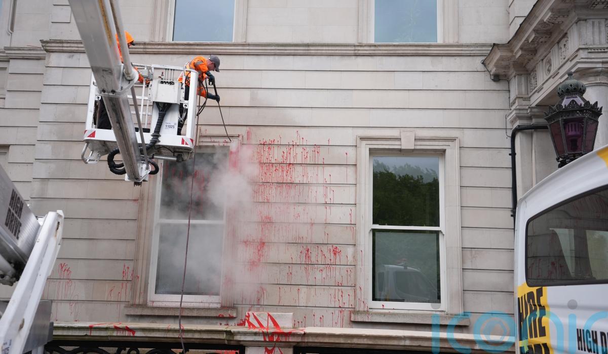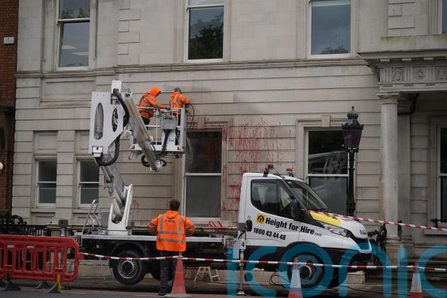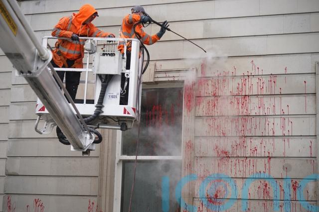 Red paint was splattered on the facade of the building, along with messages against facilitating the US military to use Shannon Airport in the south-west of Ireland and a pro-Palestinian solidarity slogan.