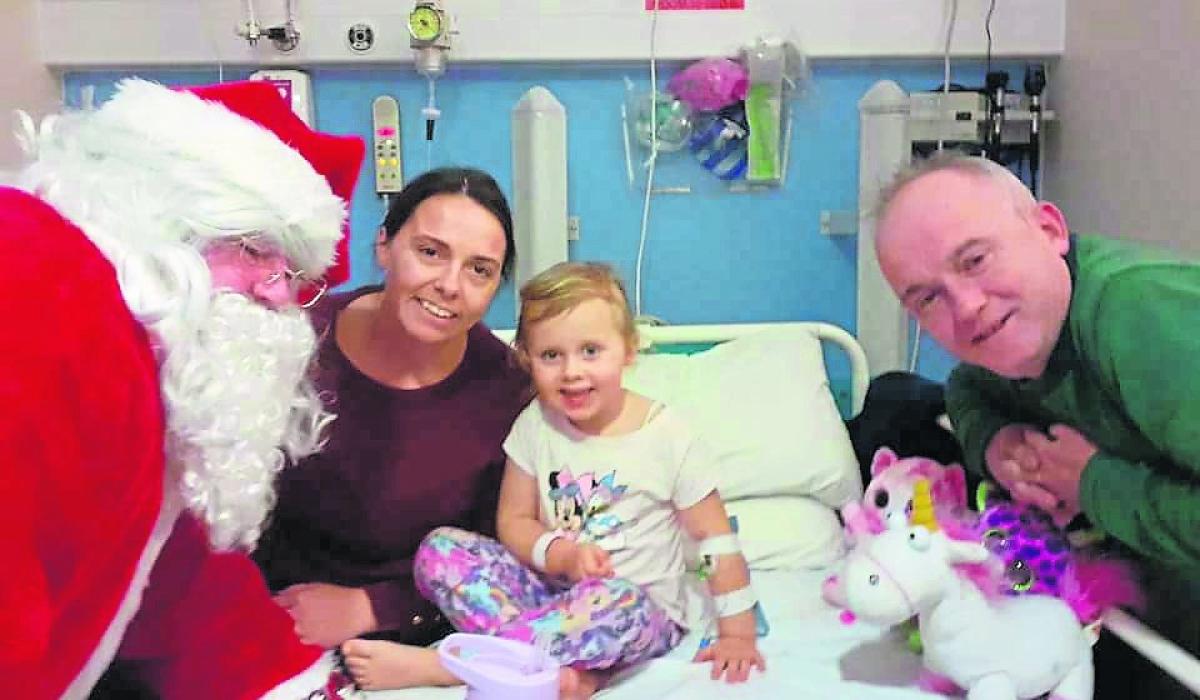 Biking Santy with a delighted patient of the Mullingar Hospital children's ward and her parents