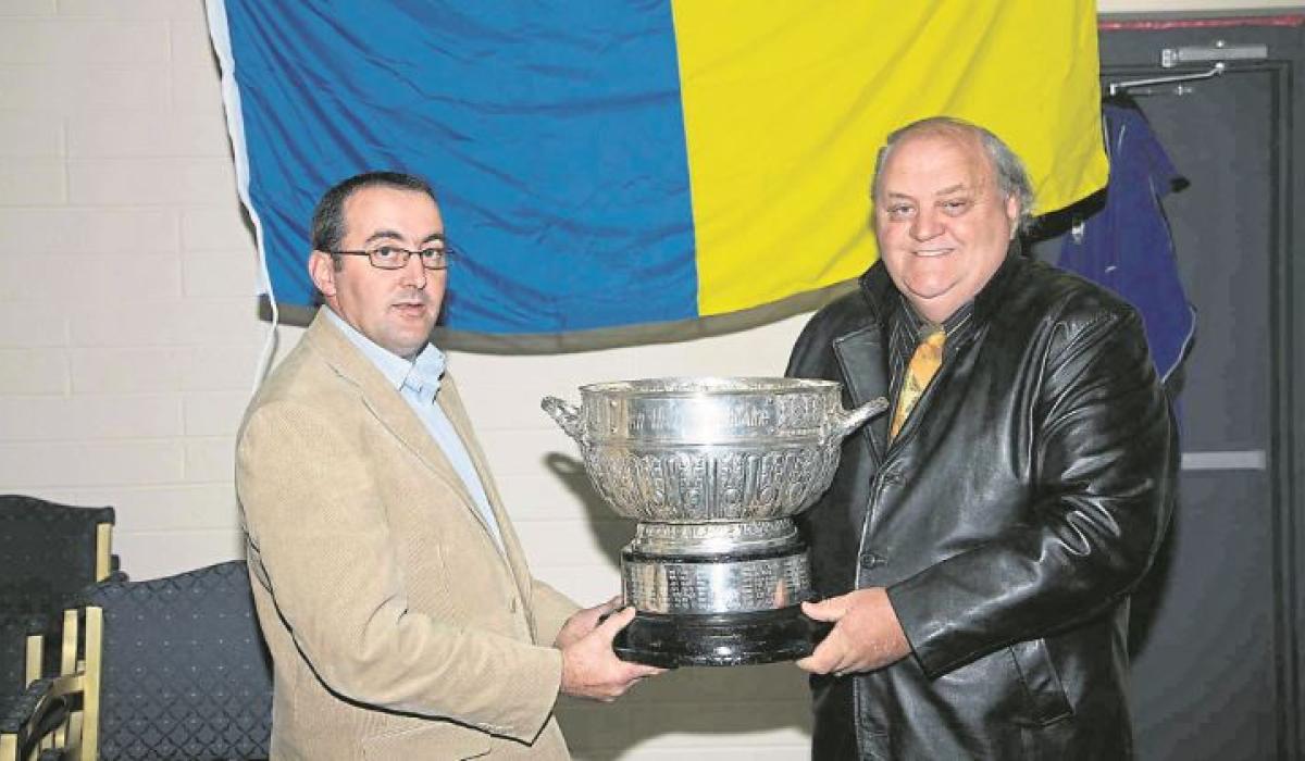 The late Vincent Daly and his son Paul holding the Delaney Cup which Vincent accepted in 1968 as Longford's only Leinster senior football championship winning captain