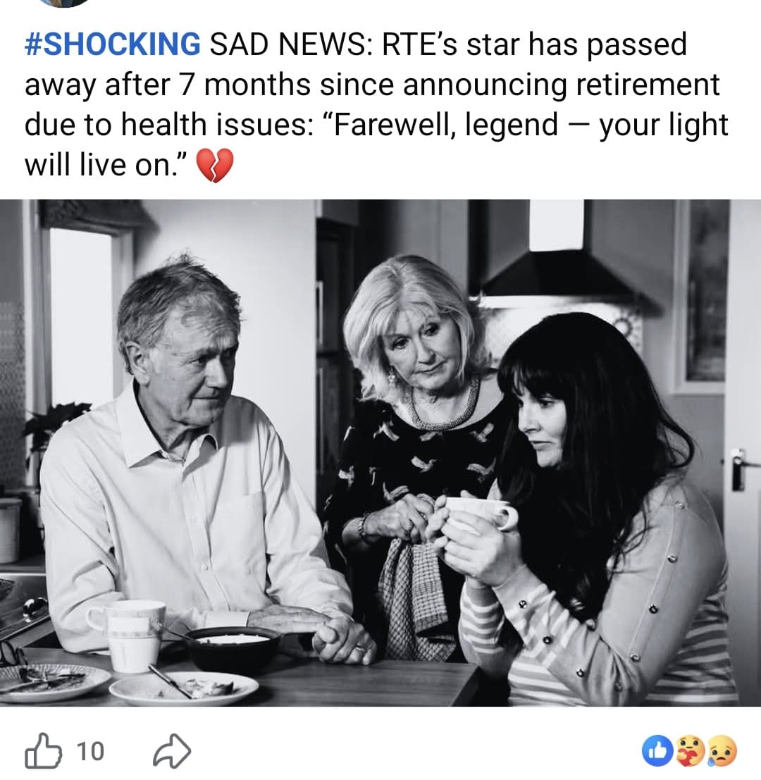 A photoshopped screenshot purporting to be from a social media account of Fair City actress Una Crawford O'Brien and which announced the death of her partner, former Fair City actor Bryan Murray, has been circulating this evening.