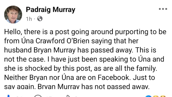 He wrote, "Hello, there is a post going around purporting to be from Úna Crawford O'Brien saying that her husband Bryan Murray has passed away. This is not the case. I have just been speaking to Úna and she is shocked by this post, as are all the family. Neither Bryan nor Úna are on Facebook. Just to say again. Bryan Murray has not passed away."
