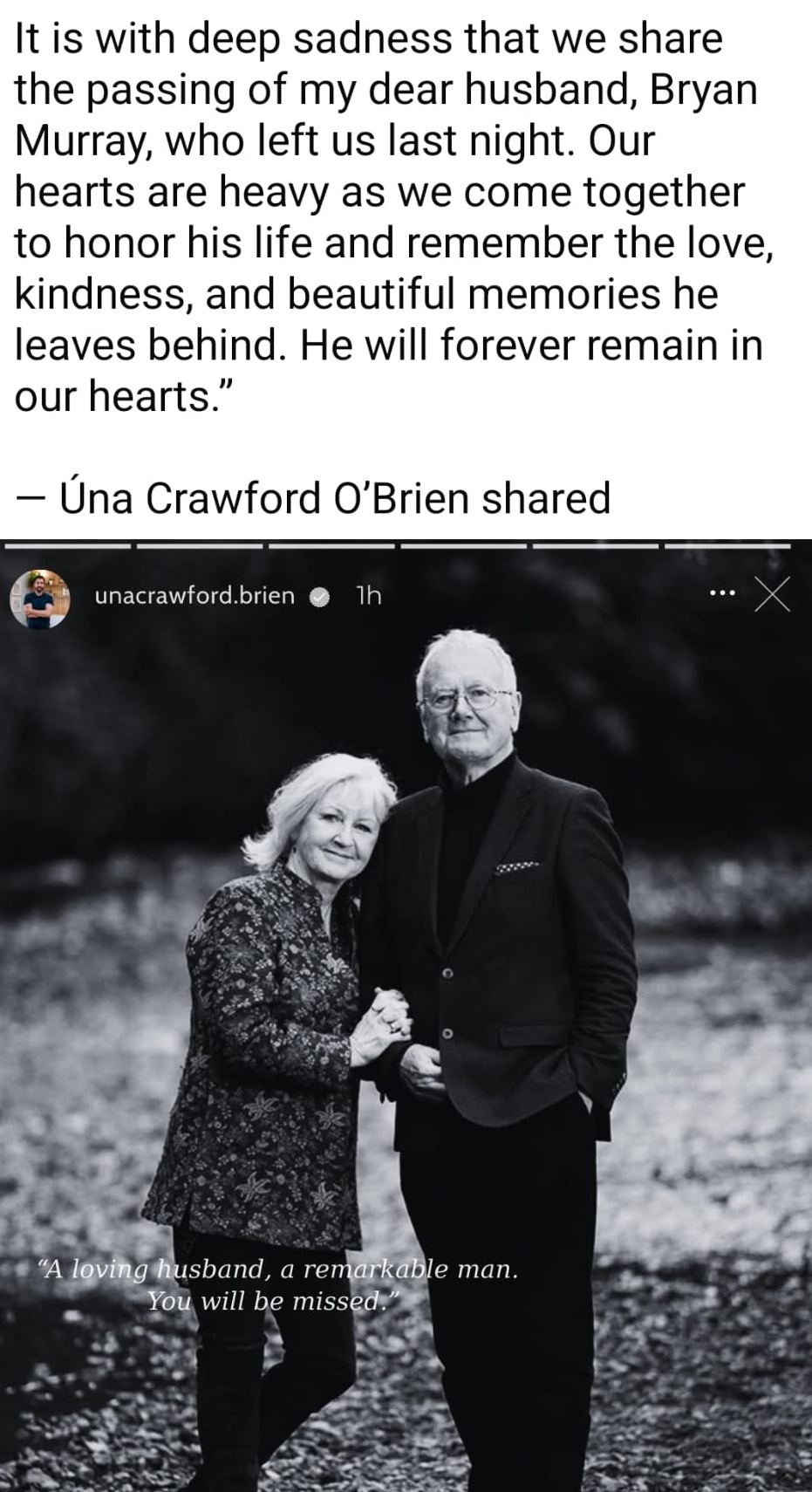 "It is with deep sadness that we share the passing of my dear husband, Bryan Murray, who left us last night. Our hearts are heavy as we come together to honor his life and remember the love, kindness, and beautiful memories he leaves behind. He will forever remain in our hearts" - Úna Crawford O'Brien shared.