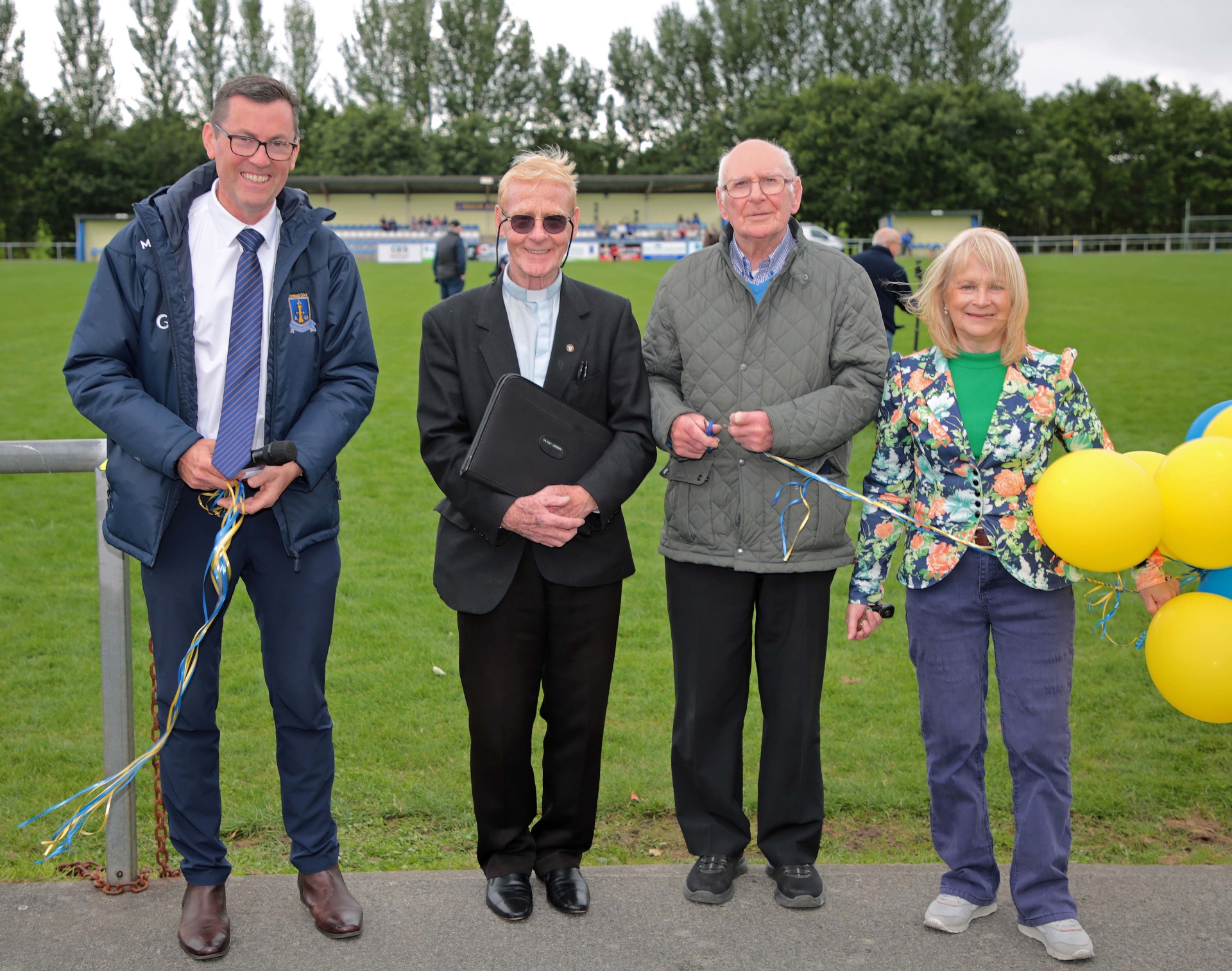 Caption: Dromard GAA Chairperson John Duffy, Fr Pat Lennon, Jimmy Fox and Teresa McNerney at the re-opening of Dromard GAA’s Páirc na nGael playing pitches after the extensive resurfacing and drainage work that was carried out over the last 12 months
