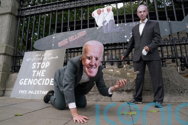 People carried signs reading “I’m a mother, not a target” and “I’m a child, not a target” and two protesters wore masks featuring the faces of Israeli Prime Minister Benjamin Netanyahu and Mr Biden.