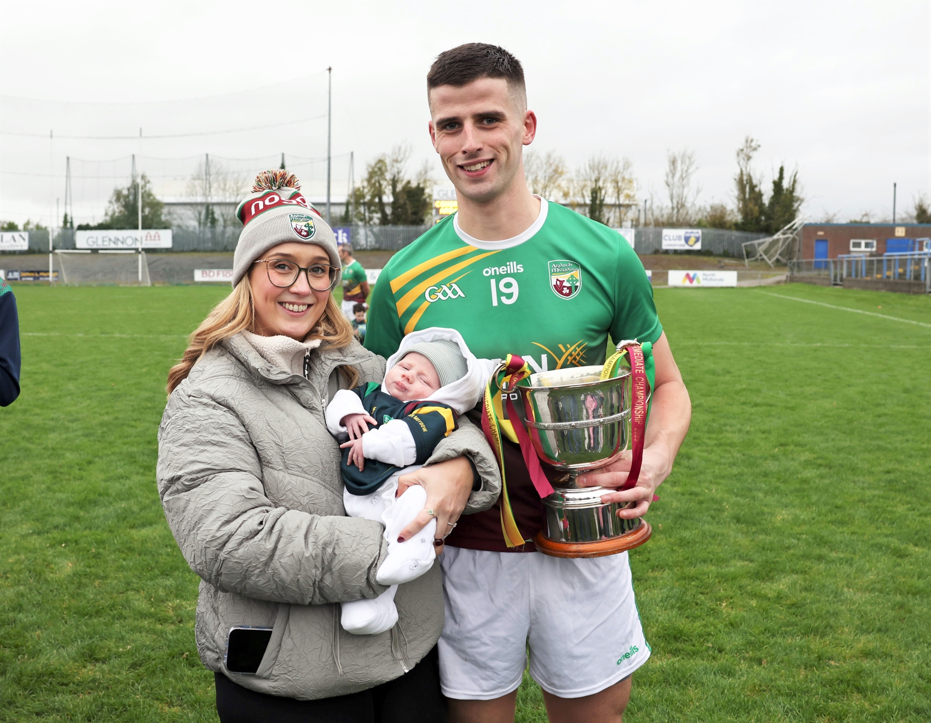 Caption: Emmet Donlon with fiance Grace Hogan and baby Finn Ned, along with the Hennessy Cup after Ardagh Moydow defeated St Brigid's Killashee to capture the Mulleady Group Longford Intermediate Football Championship title for the first time last Sunday in Glennon Brothers Pearse Park. Picture: Syl Healy