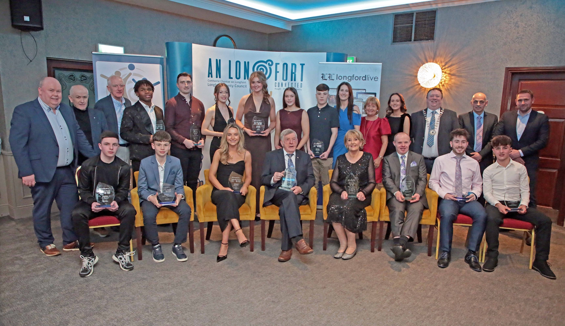 CAPTION: At the Longford Leader Sports Awards 2025, in association with Longford Sports Partnership, were front row l to r; Joe Shannon (Snooker), Andrew Fitzpatrick (Athletics), Orla Nevin (Ladies Football), Liam Fenelon (Hall of Fame), Rheda Quinn (Club Volunteer of the Year), Seán Keenan (Sports Ability Award), Micheál Mulcahy (GAA Hurling) and Fionn McCormack Crowe (Soccer). Back; Longford Leader Managing Editor Alan Walsh, Longford Leader Sports Editor Padraic O'Brien, Longford Sports Partnership Chairperson Tony Headon, Goodness Ogbonna (Soccer), Ronan Keogh (captain Killoe senior footballers, Team of the Year), Robin Óg Murphy (Junior Sportsperson of the Year), Mia Rowan (Rugby), Evelyn Murray (Equestrian), John Nevin (Boxing), Longford Sports Partnership Coordinator Sarah Mulligan, Longford Leader Advertising Executive Audrey Moorhead, Longford Leader Media Specialist Jess McCaul, Longford County Council Leas Cathaoirleach Cllr Niall Gannon, Longford Sports Partnership Programme Manager Donal Mulligan and Longford Leader Regional Sales Director Dessie Connolly Picture: Shelley Corcoran