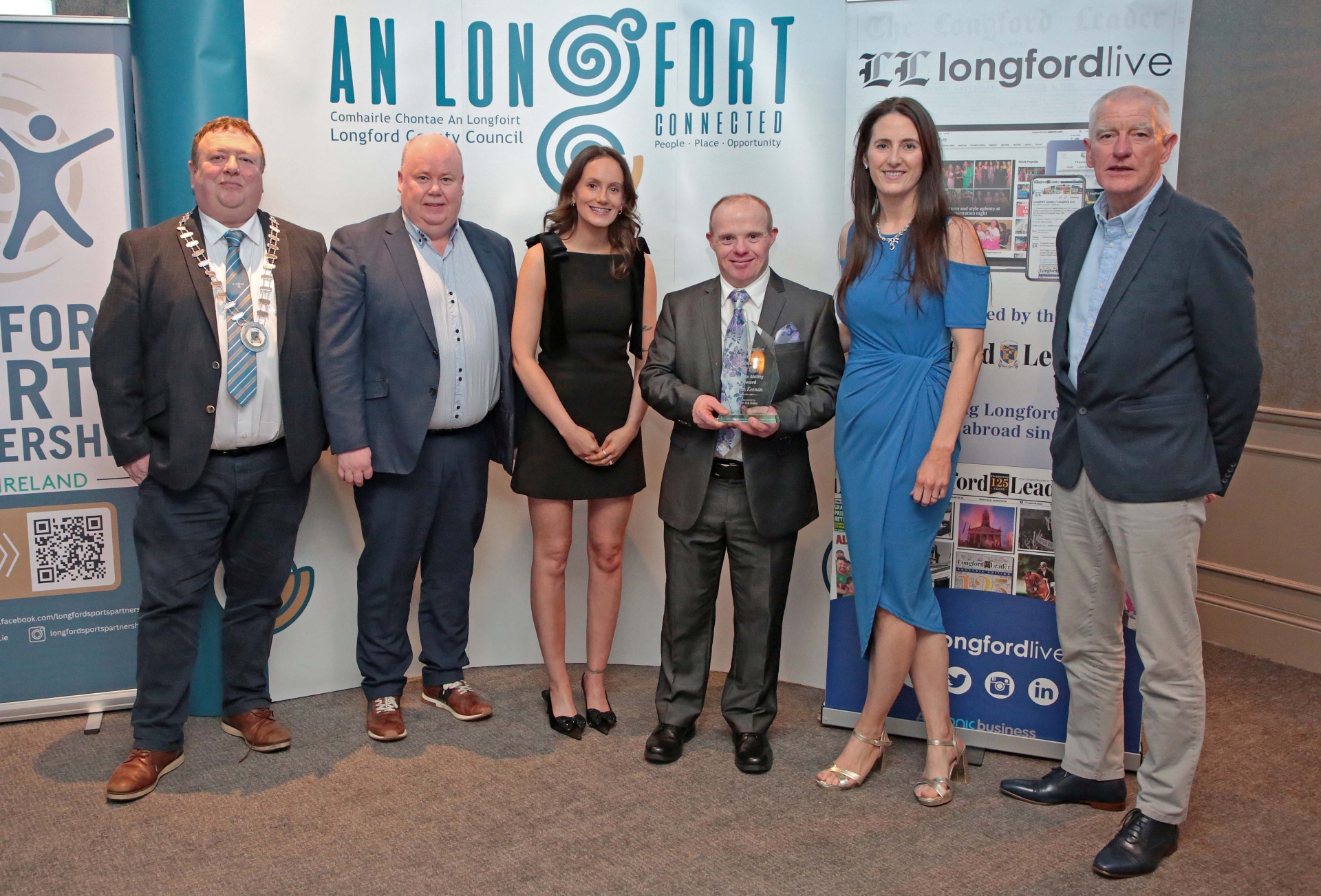 CAPTION: Longford Leader Managing Editor Alan Walsh, Longford County Council Leas Cathaoirleach Cllr Niall Gannon, Longford Leader Media Specialist Jess McCaul (on behalf of sponsor Pat the Baker), Sports Ability Award winner Seán Keenan, Longford Sports Partnership Coordinator Sarah Mulligan and Longford Sports Partnership Chairperson Tony Headon Picture: Shelley Corcoran