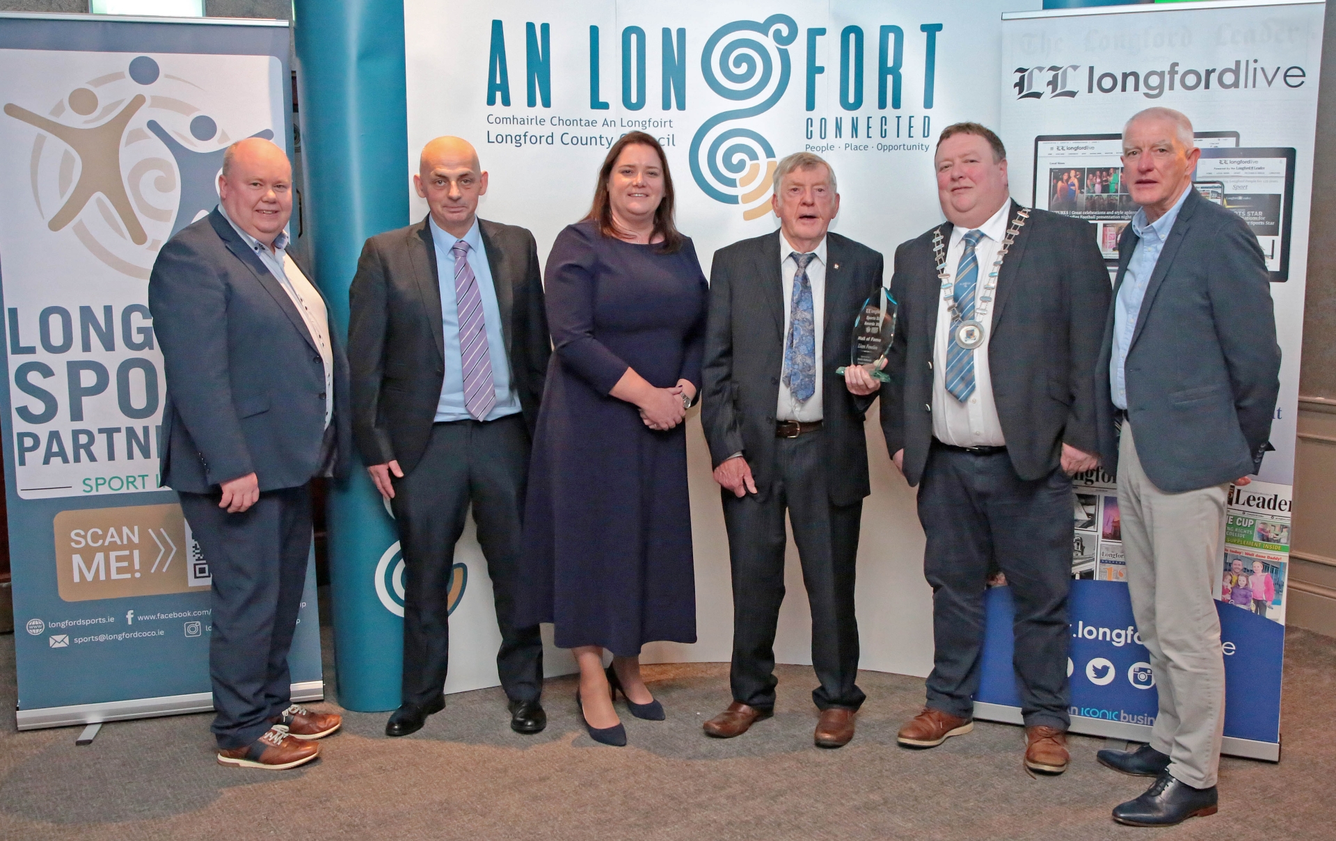 CAPTION: Longford Leader Managing Editor Alan Walsh, Longford Sports Partnership Programme Manager Donal Mulligan, Gillian Wallace (sponsor North Midlands Credit Union), Hall of Fame award winner Liam Fenelon (Longford Marathon), Longford County Council Leas Cathaoirleach Cllr Niall Gannon and Longford Sports Partnership Chairperson Tony Headon Picture: Shelley Corcoran