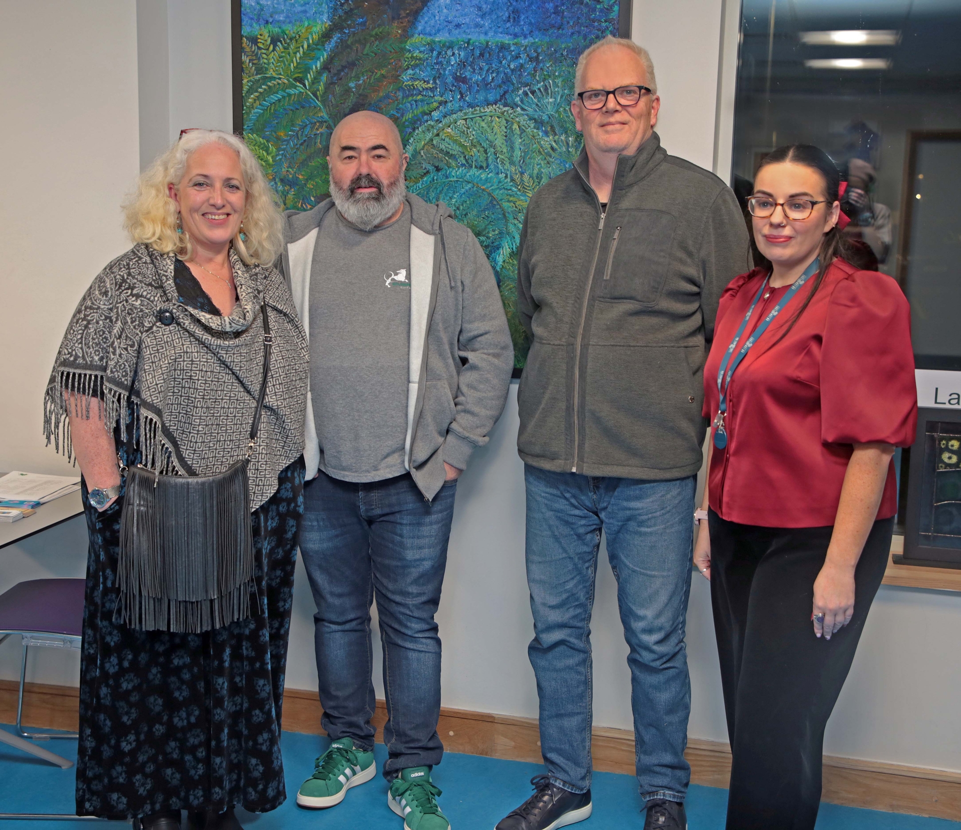 Caption: Artists and organisers; Anna D. and Phil Atkinson, Opening the show Luke Danniells, Librarian Kim Taylor