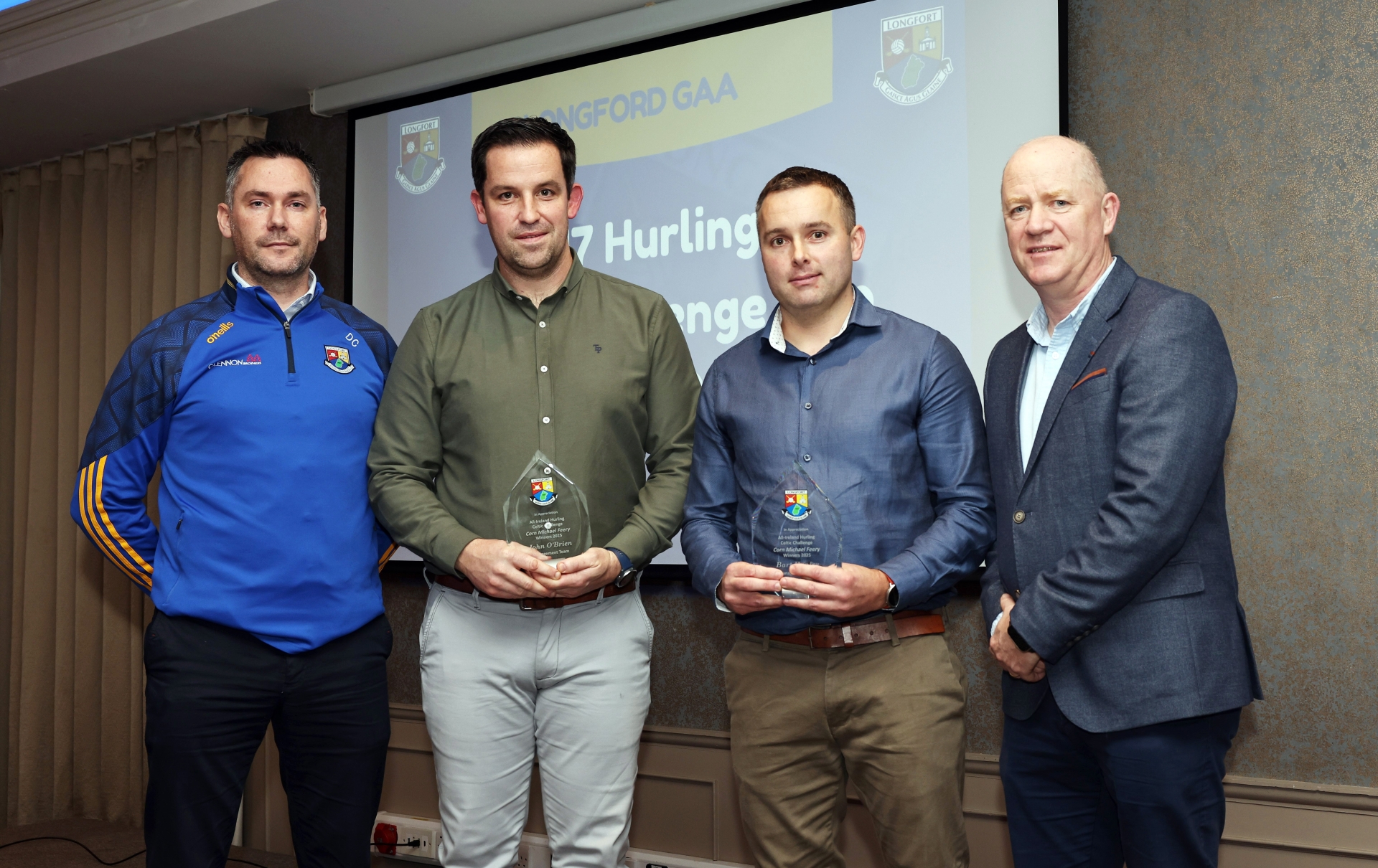 Caption: Longford Senior Hurling manager Diarmuid Cahill, Longford Minor Hurling manager John O'Brien, Minor Hurling selector Bart Hanley & Longford GAA Chairperson Derek Fahy