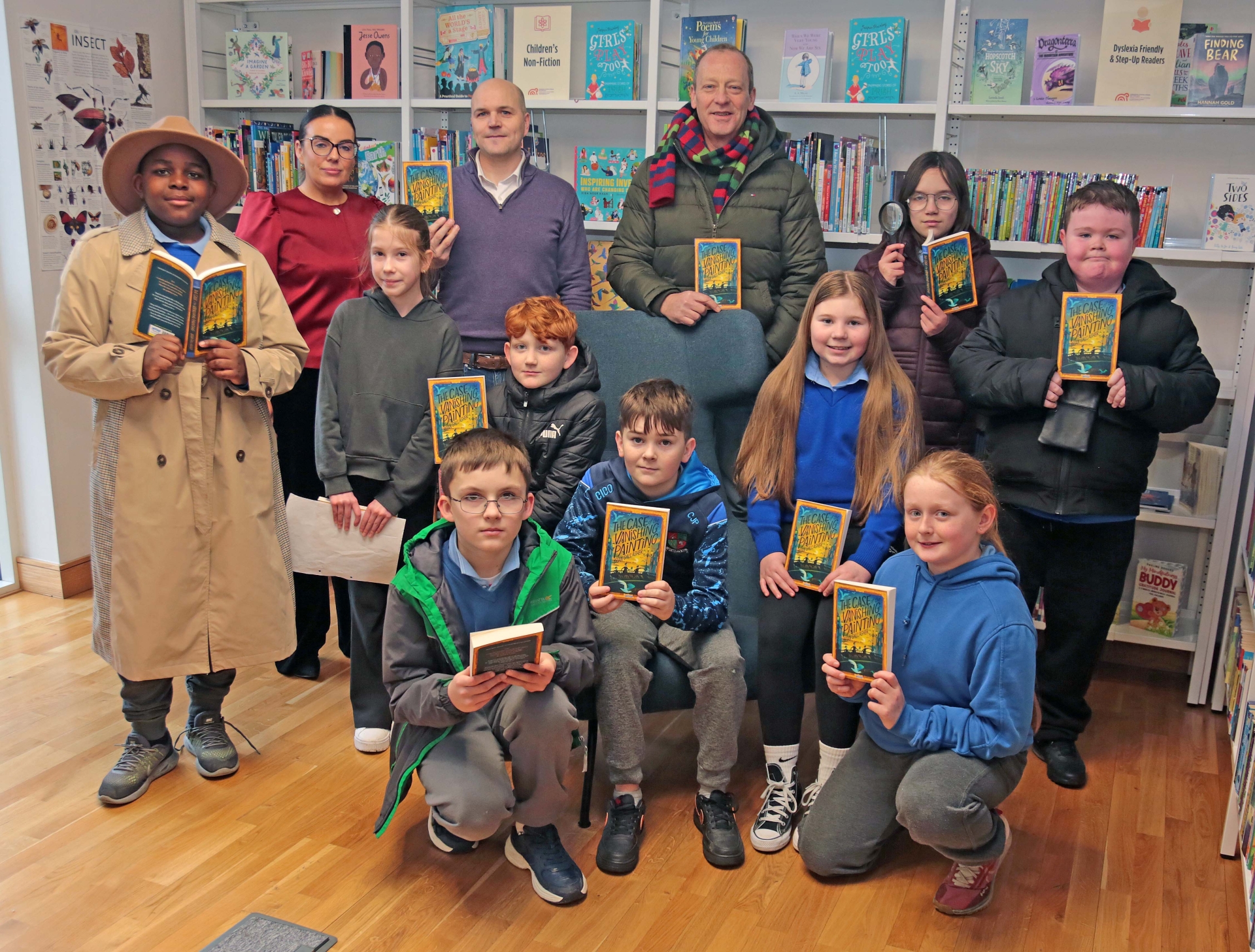 Caption: St Mary's NS students with Kim Taylor (Branch Librarian), Enda Ward (Home School Community Liason Officer), Alan Conroy (Principal St Mary's)