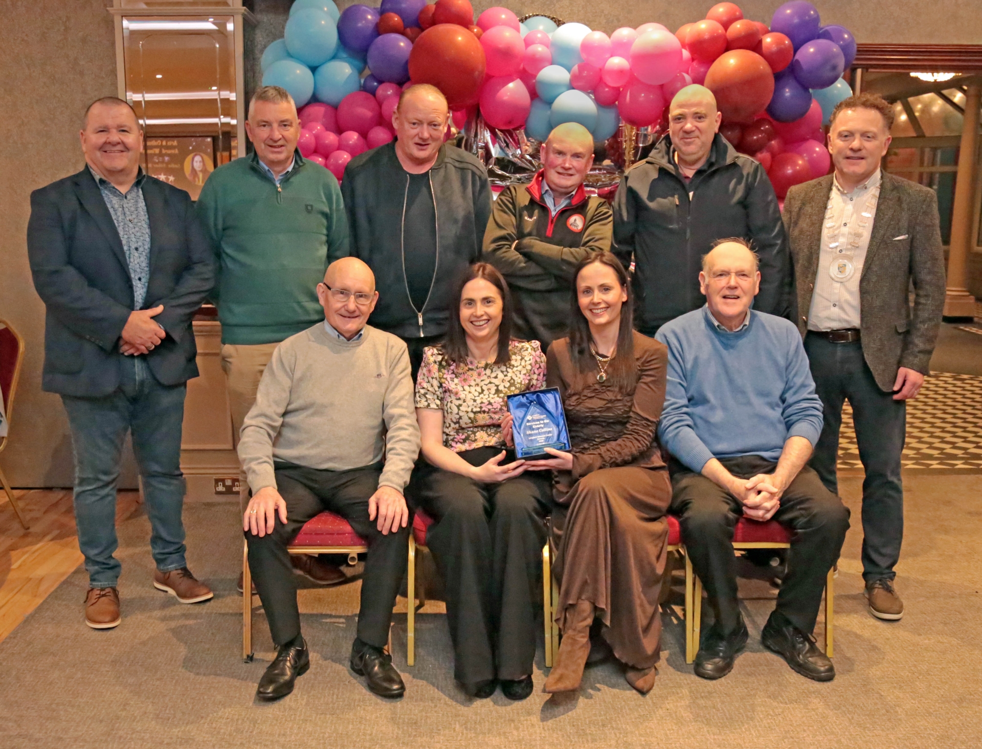 Caption: Cllr Gary Murtagh, Gerry Smyth, with Roisín and Áine Cunningham, Sean Dempsey, Ray Masterson, Michael Nevin, Kris Richardson, George McVeigh, Fulton Grant