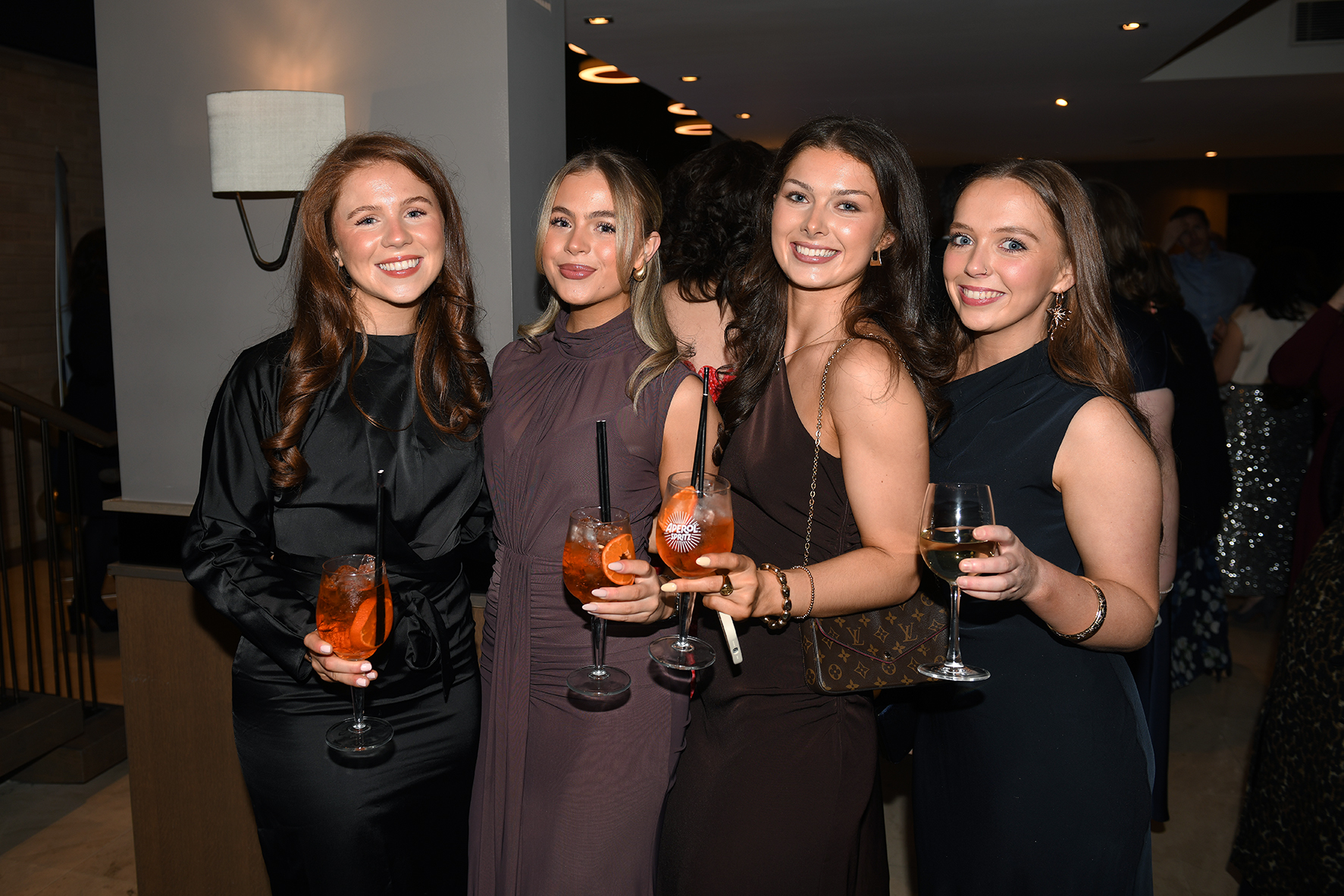Caption: Caitlin and Roisin Horohoe and Anna Maguire (Lanesboro) and Niamh Harte (Killoe) enjoying the Longford Association in London 70th anniversary dinner dance in the Clayton Hotel, Chiswick Picture: Malcolm McNally