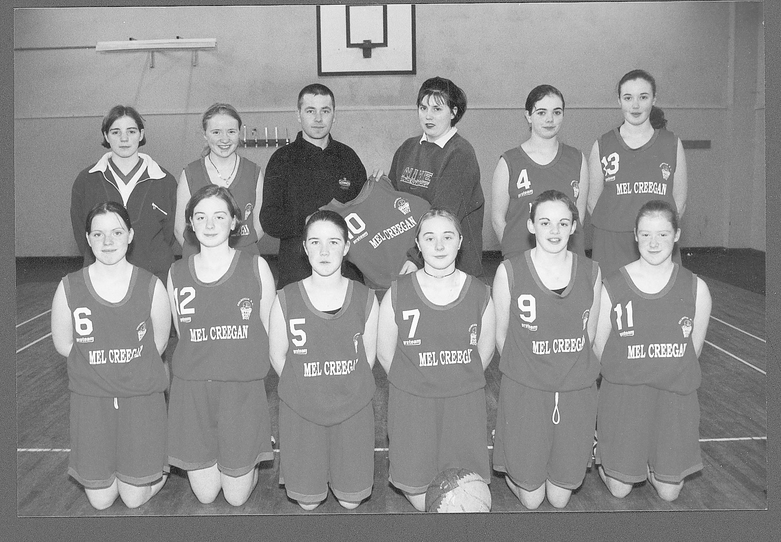 Caption: The coach of the Colmcille basketball team Christine Kelleher accepting a new kit from sponsor Mel Creegan with team, back – Sharon Treacy, Anita Reilly, Eileen Reilly and Camilla Reilly; front: Pamela Mulligan, Jacqueline Reilly, Alison McKeon, Aishling Reilly, Pauline Farrell and Patricia Reilly