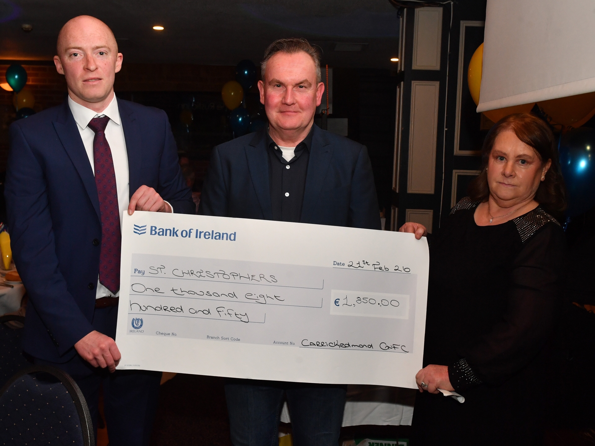 Caption: Club Chairperson Barry O'Farrell together with Mairead McDonnell presenting a cheque for €1,850 to Declan Kenny CEO of St Christopher's, proceeds of the St Stephen's day charity match and donations at the club's recent dinner dance