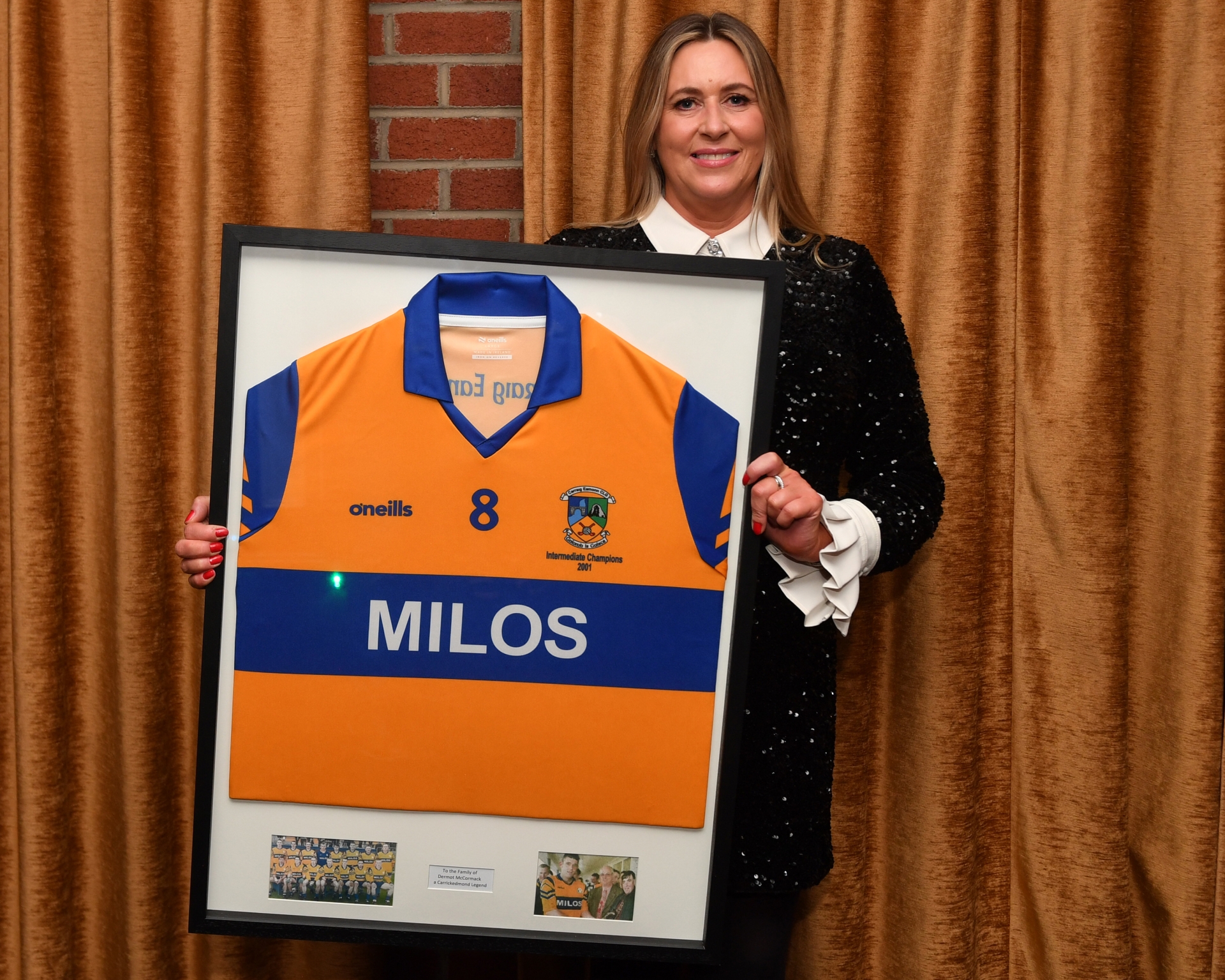 Caption: Charlotte McCormack, wife of the late Dermot McCormack who was part of the 2001 Carrickedmond Intermediate Championship winning team, presented with a framed jersey in memory of her husband