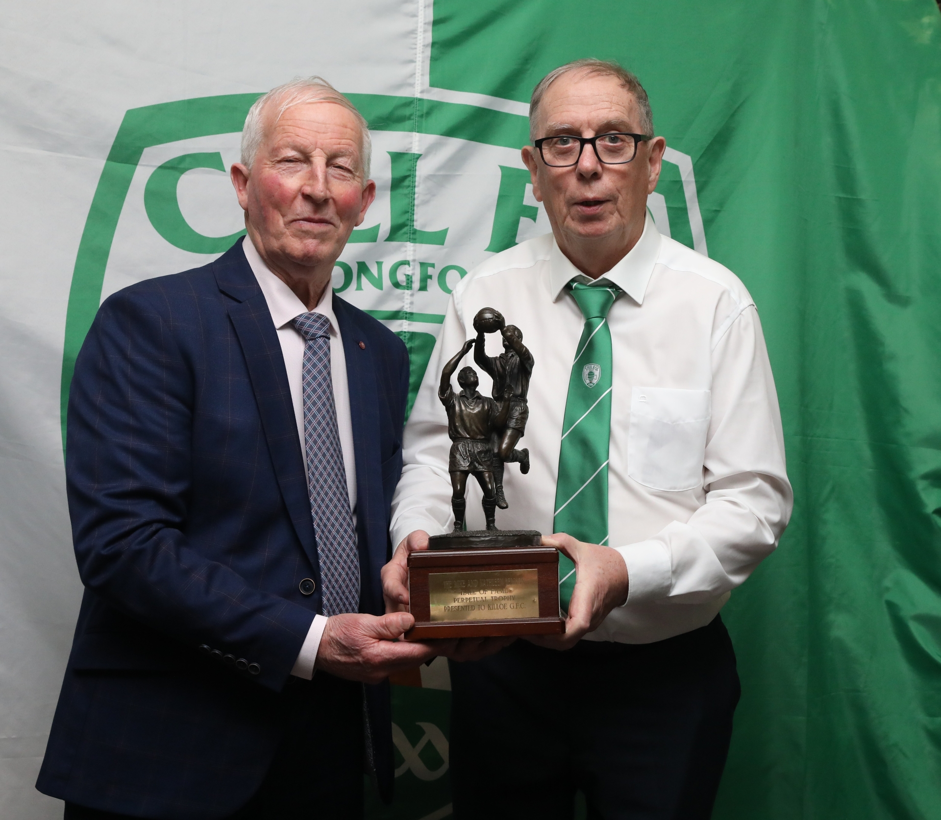 Caption: Colm O’Donnell receives the Hall of Fame Award 2025 from Paddy Lennon at the Emmet Óg Killoe dinner dance Picture: Gerry Rowley