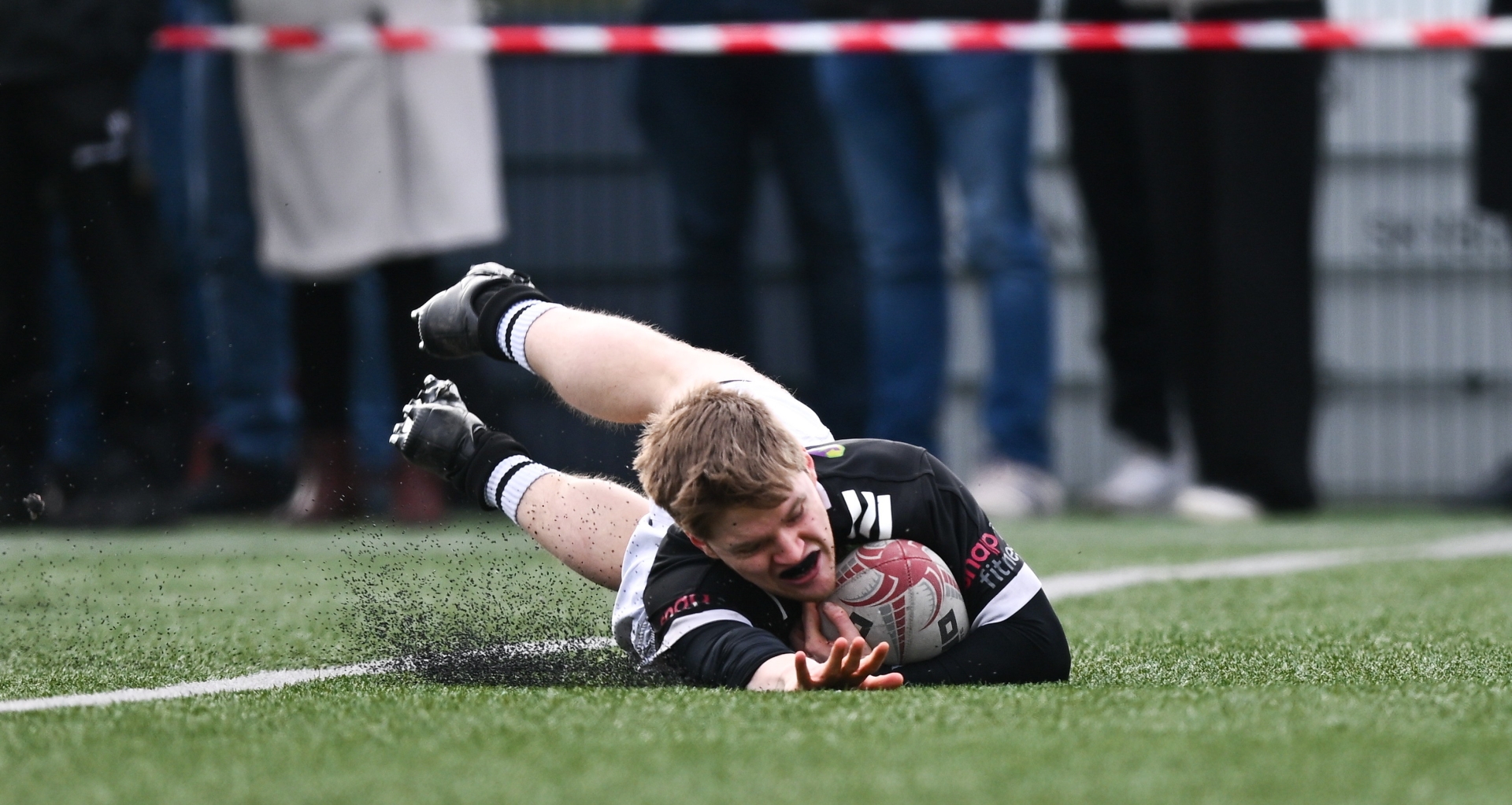 Caption: David Connolly of Longord RFC dives over to score his side's fourth try during the Bank of Ireland Provincial Towns Cup Round 2 match between Longford RFC and Mullingar at Precision Health Park in Longford. Photo by Tyler Miller/Sportsfile