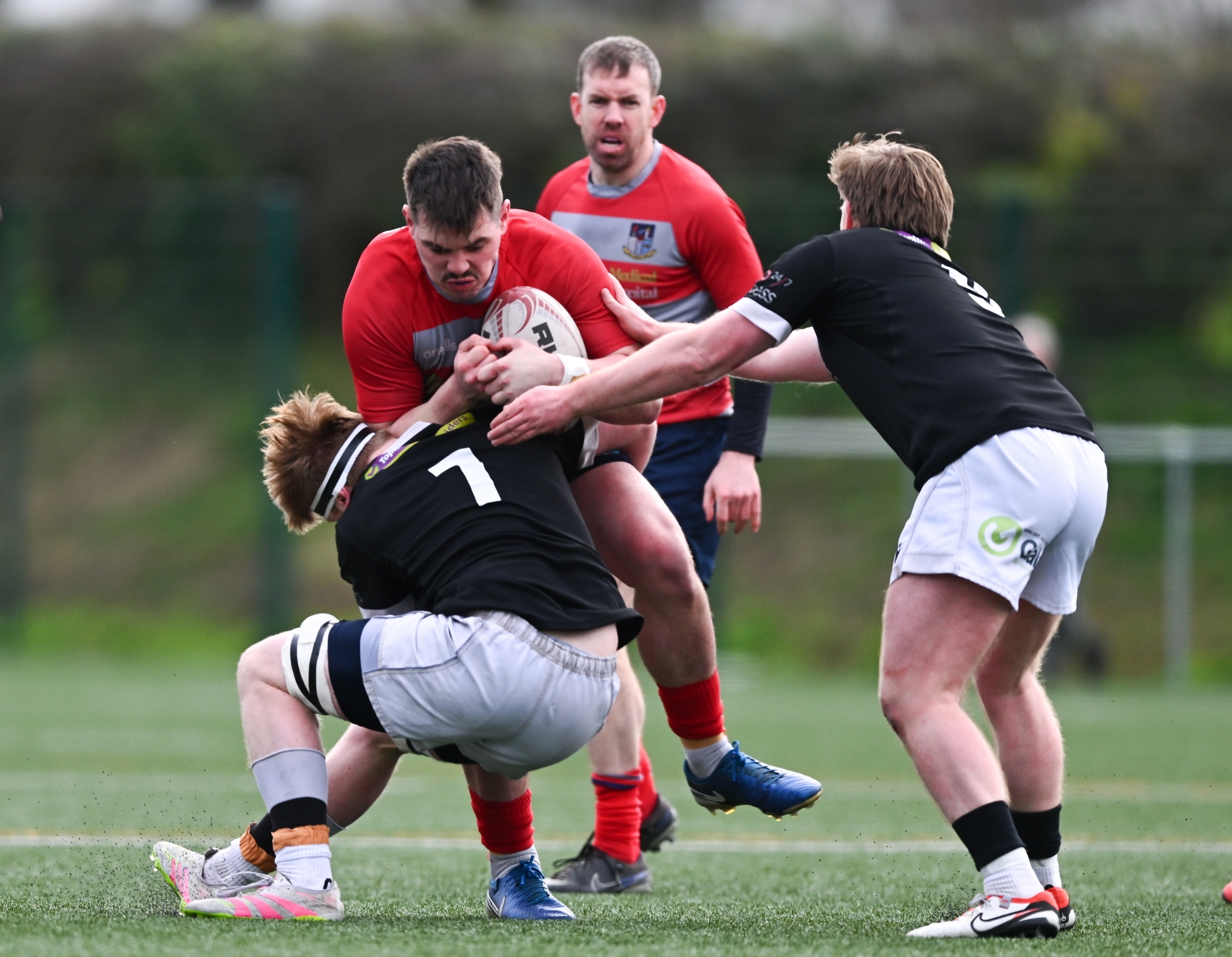 Caption: David Manning of Mullingar in action against Mark McHugh of Longford RFC during the Bank of Ireland Provincial Towns Cup Round 2 match between Longford RFC and Mullingar at Precision Health Park in Longford. Photo by Tyler Miller/Sportsfile