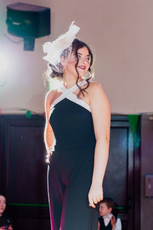Caption: Aoife Cadam modelling an occasional wear jumpsuit and matching headpiece. Pic. Brian McCann