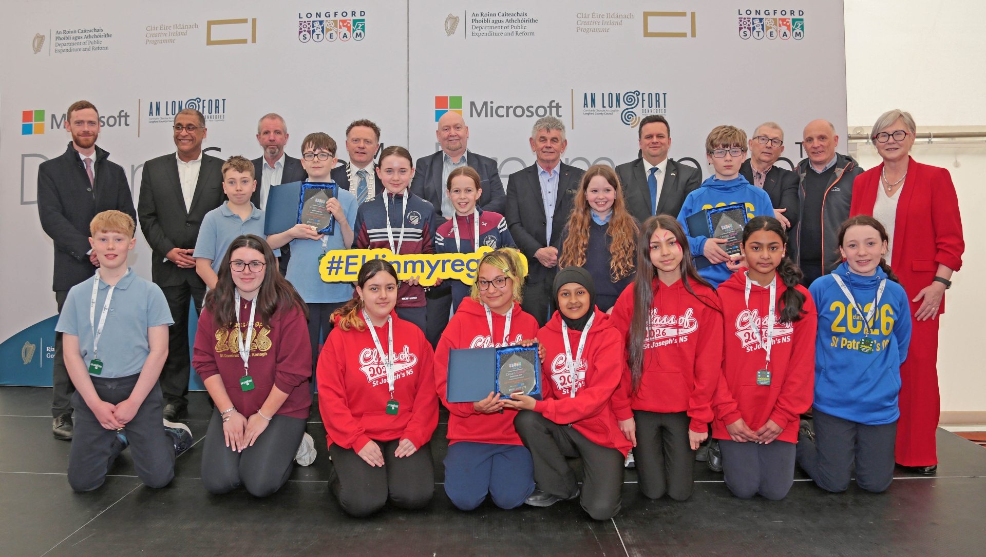 Caption: Age Friendly winners St Dominic's NS Kenagh, Naomh Padraig NS Killeen and St Joseph's NS Longford at Longford’s Microsoft Dream Space Showcase in St Mary’s Community Campus, Edgeworthstown Picture: Shelley Corcoran