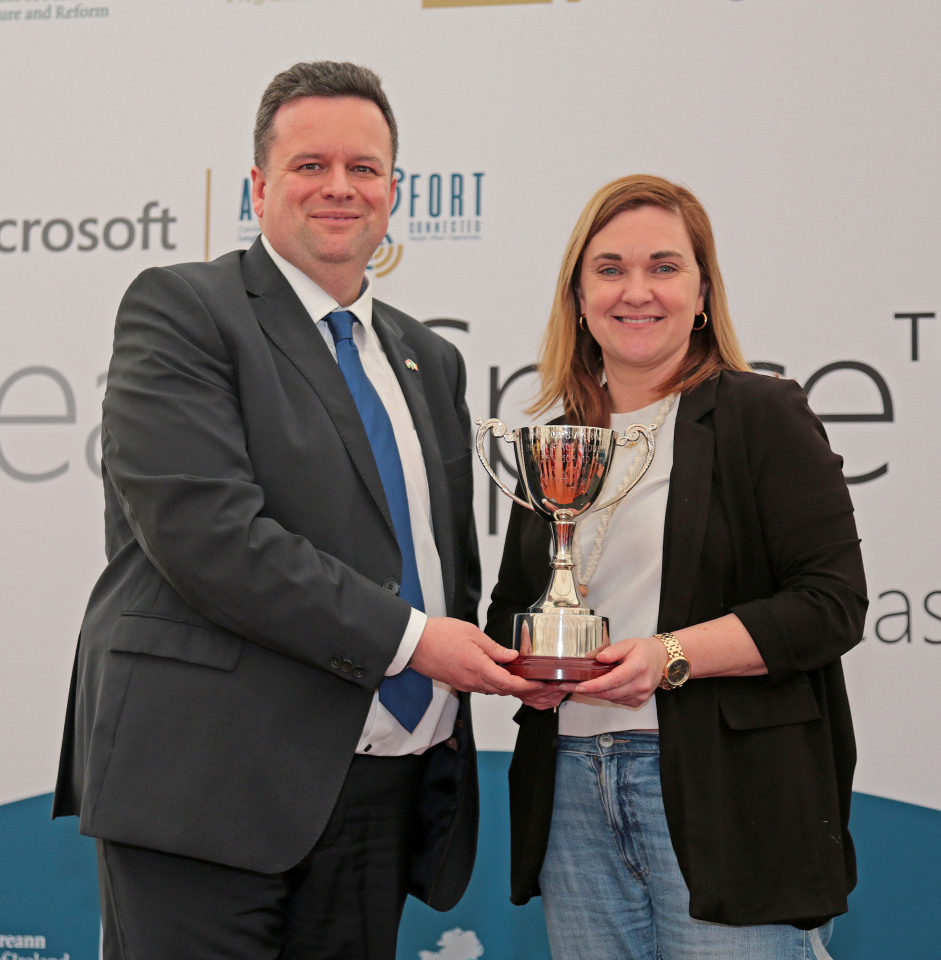 Caption: Ambassador of Hungary to Ireland Gergely Bánhegyi and Sarah Jane Walsh, teacher of children in St Mary's Edgeworthstown who won the Rising Star award at the annual Longford Microsoft Dream Space Showcase Picture: Shelley Corcoran